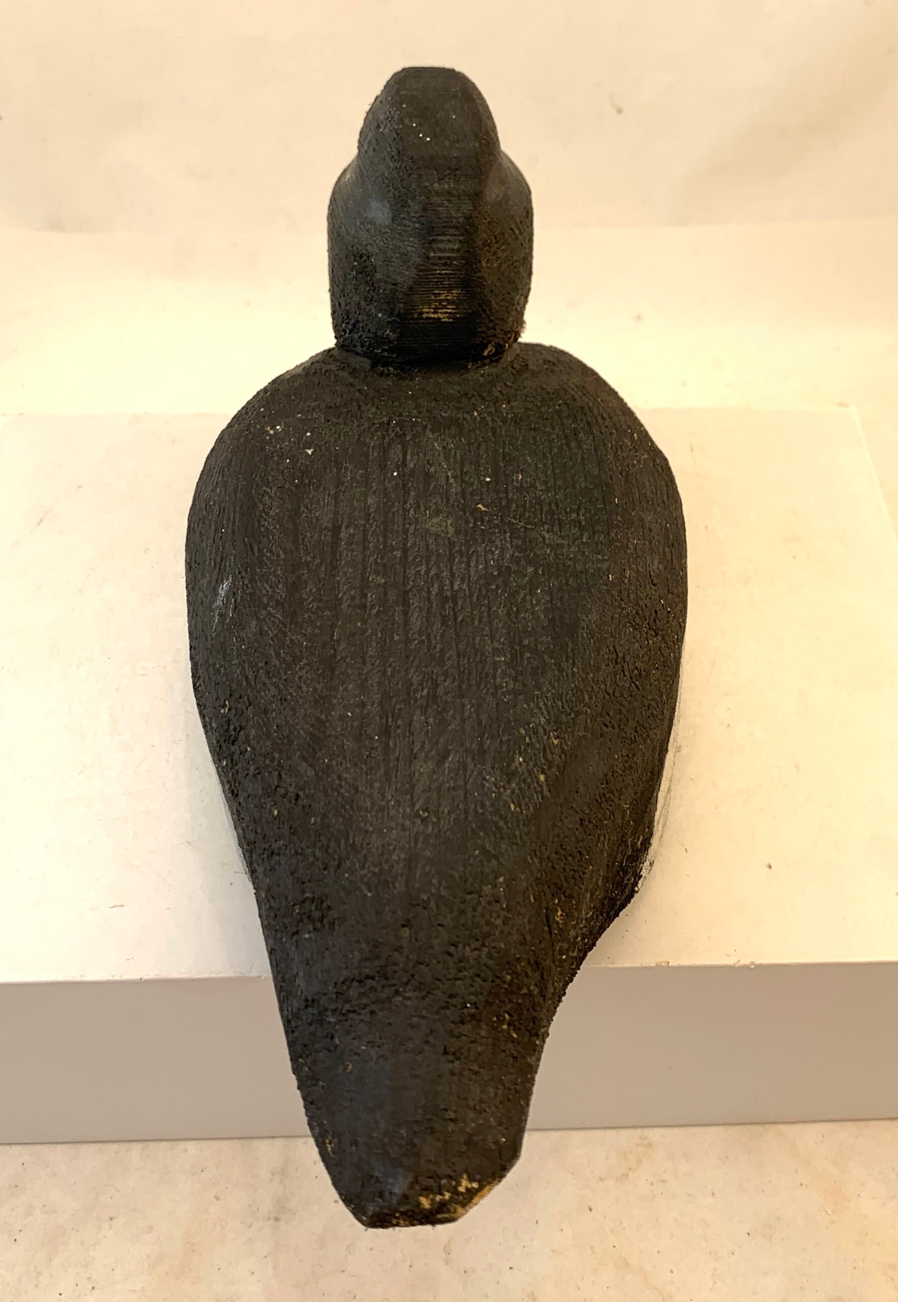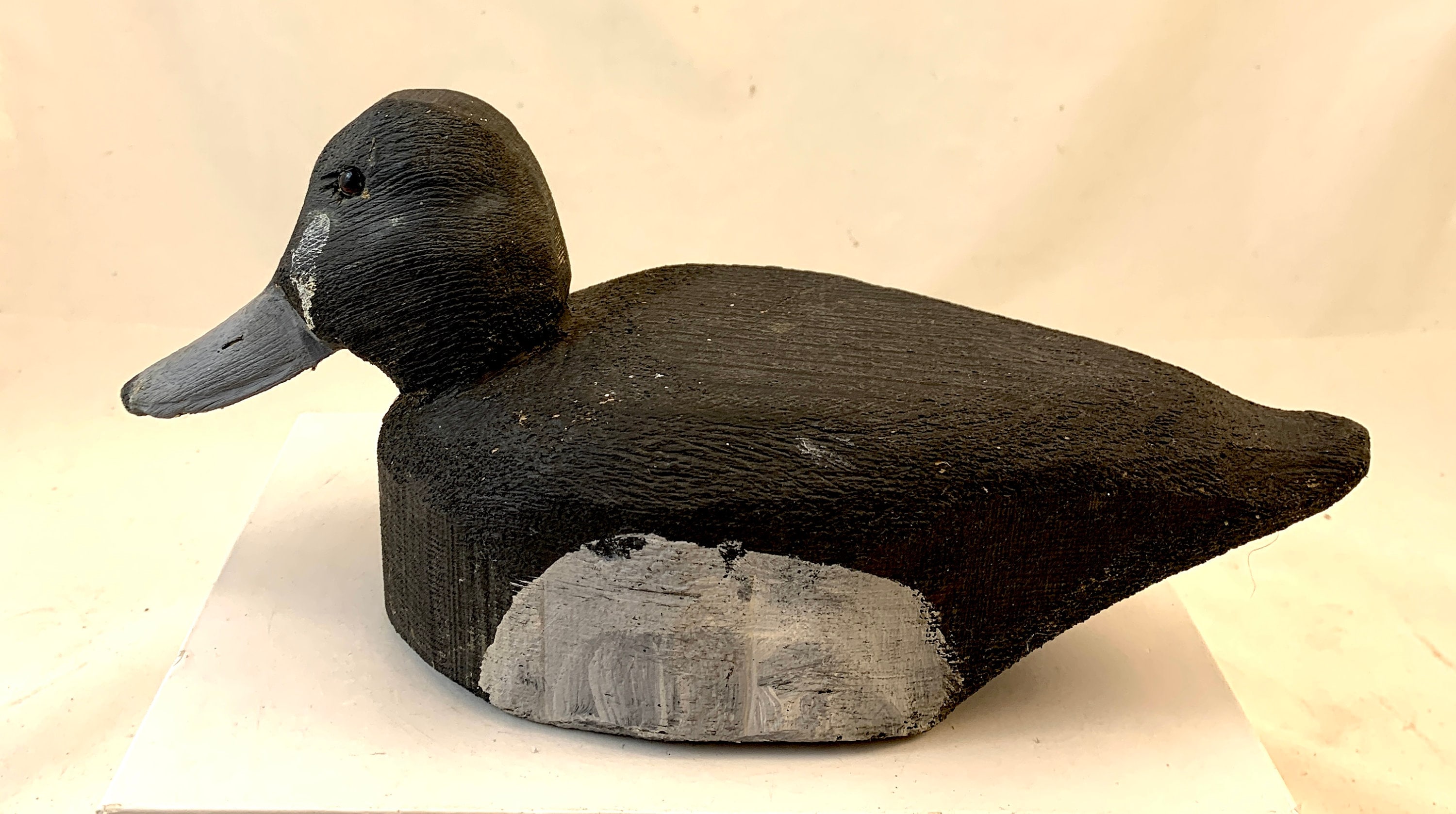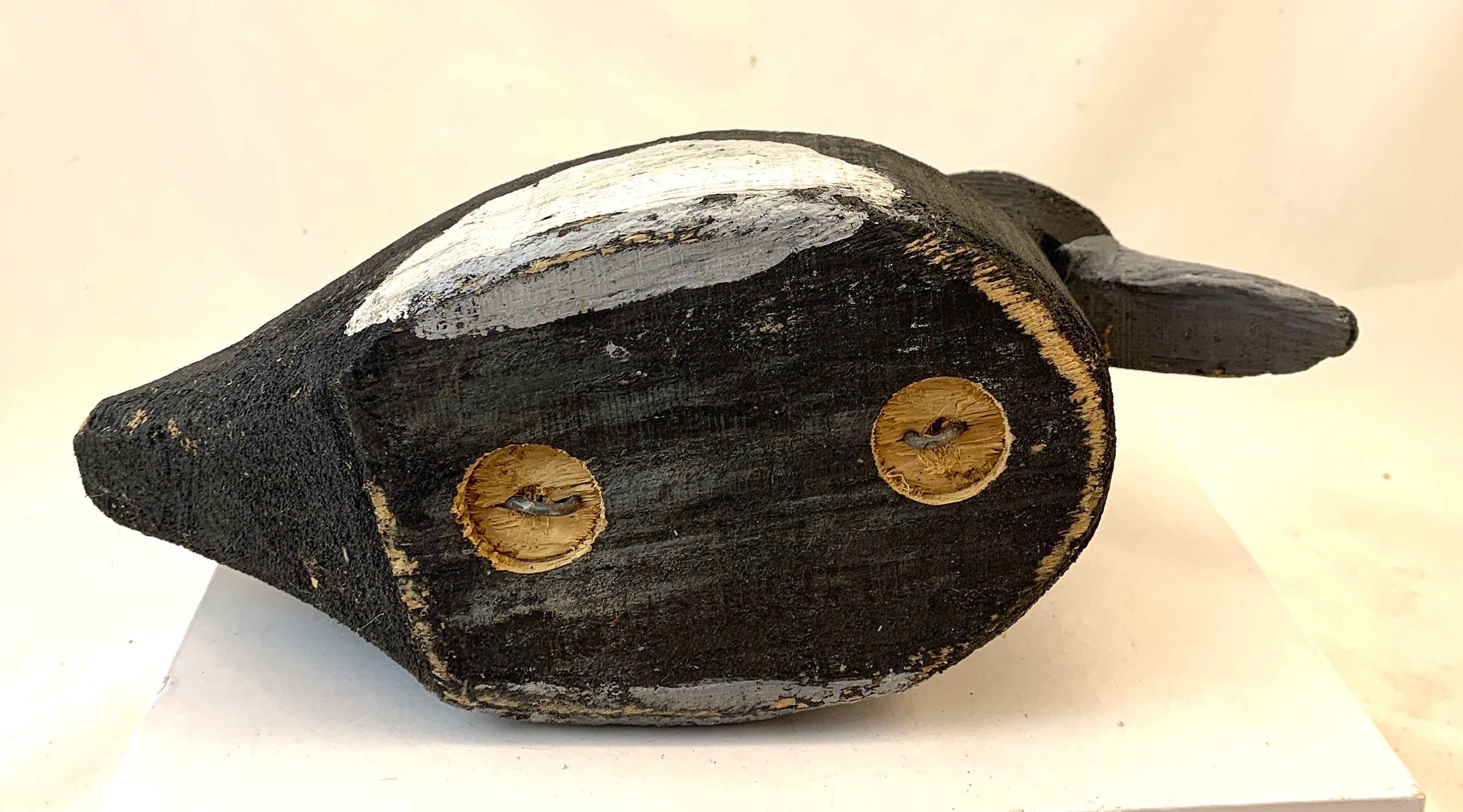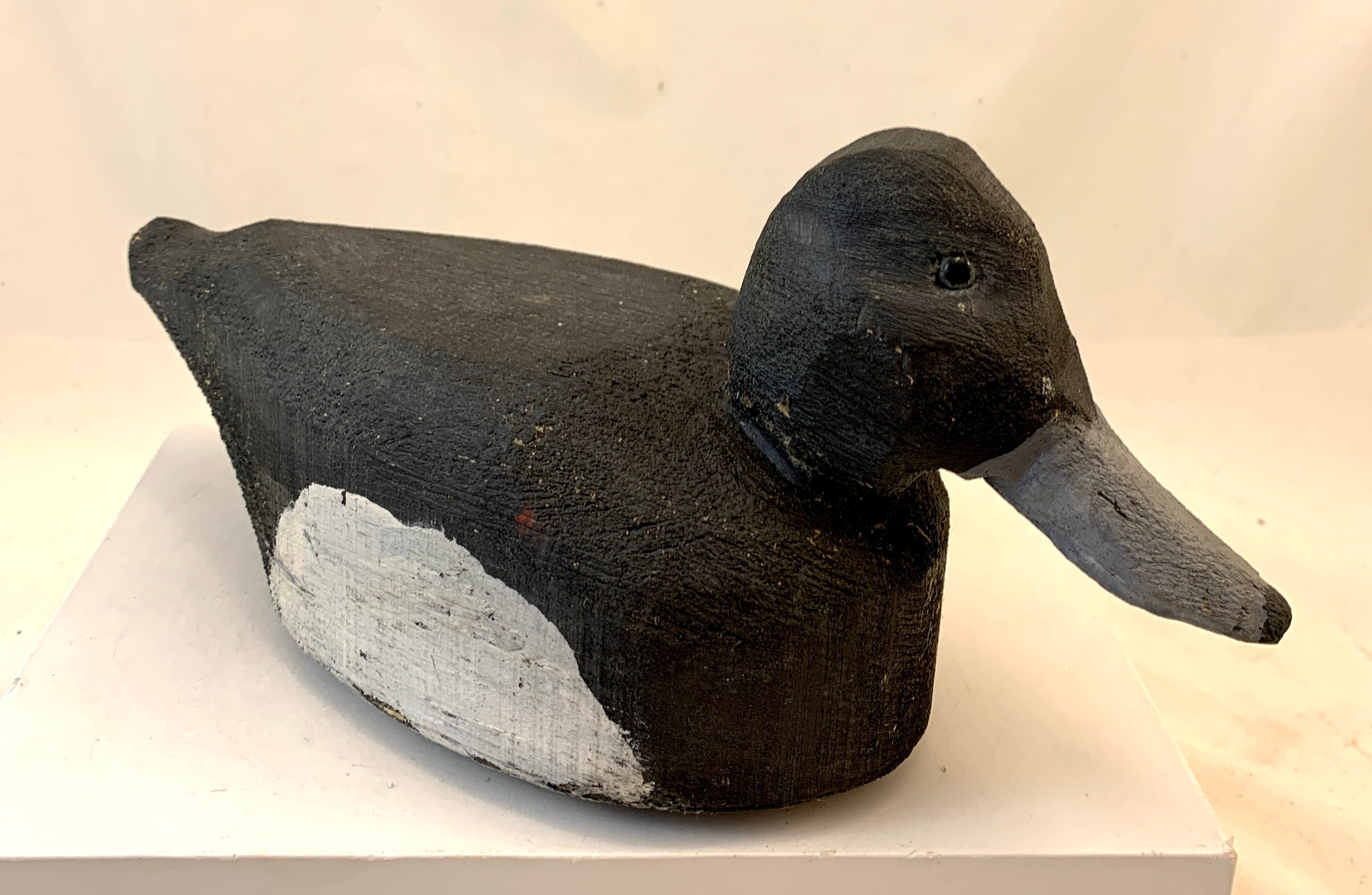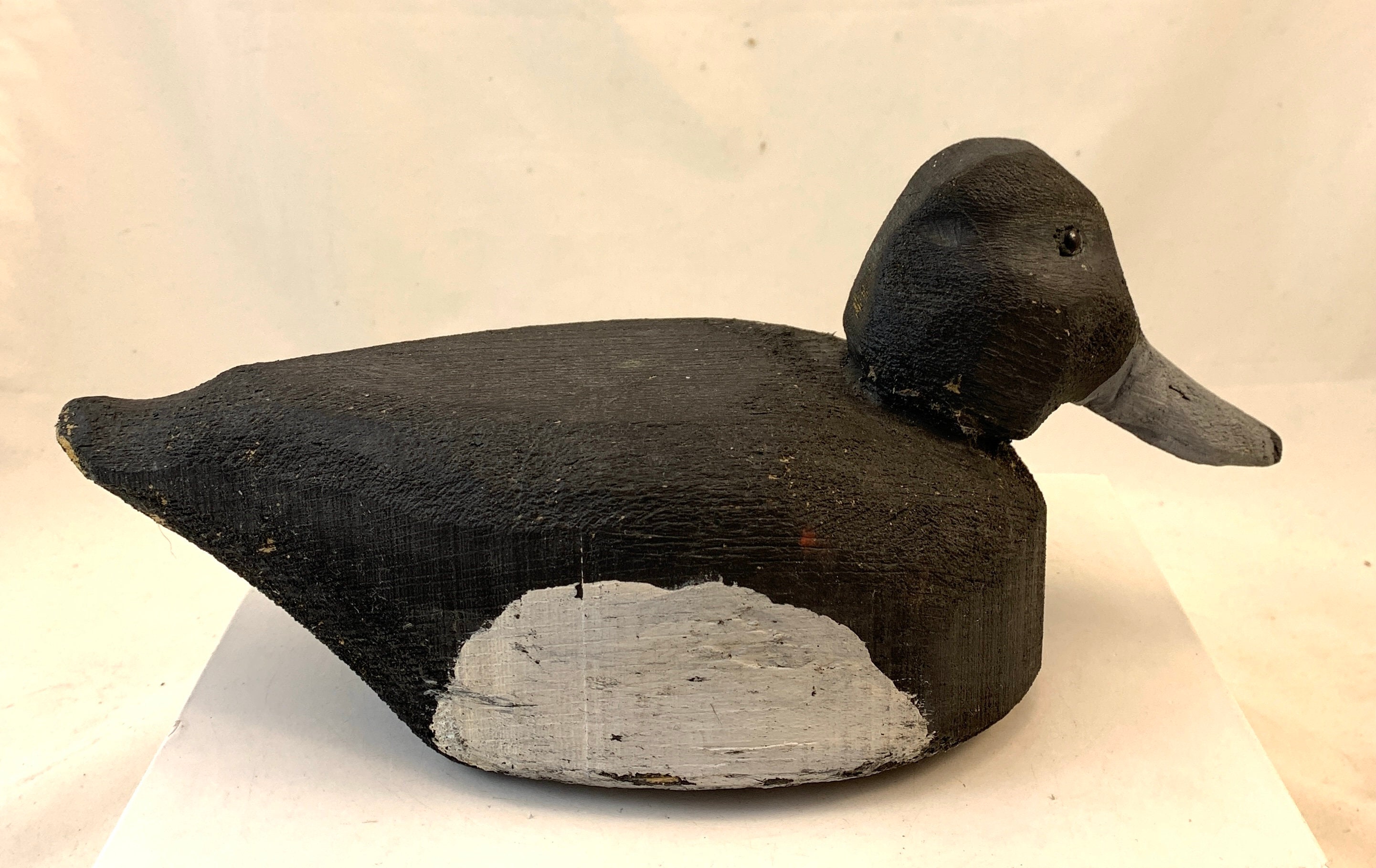 Condition: In good condition, some wear to the paint, and there is a white paint splash on the head of the decoy.