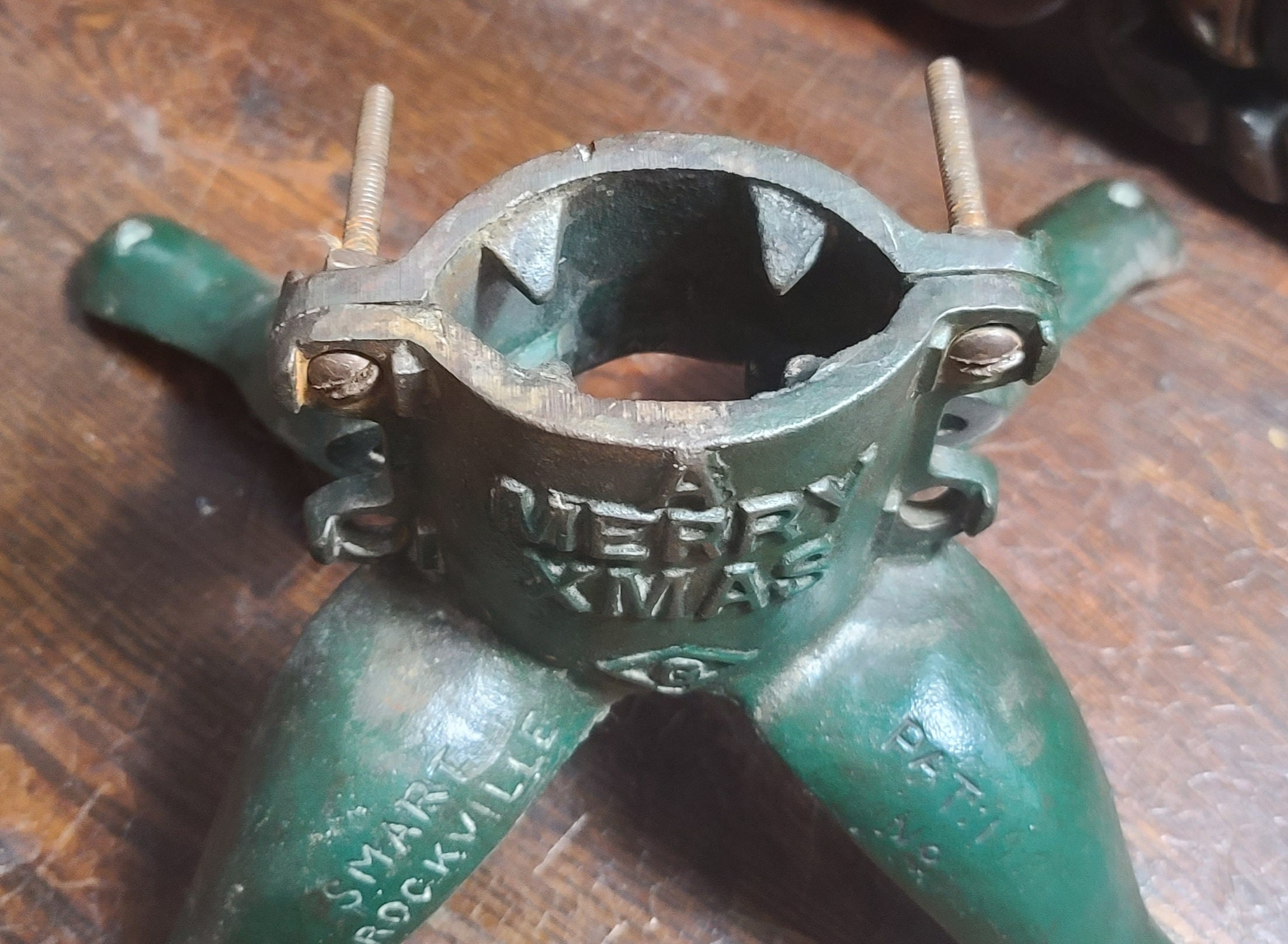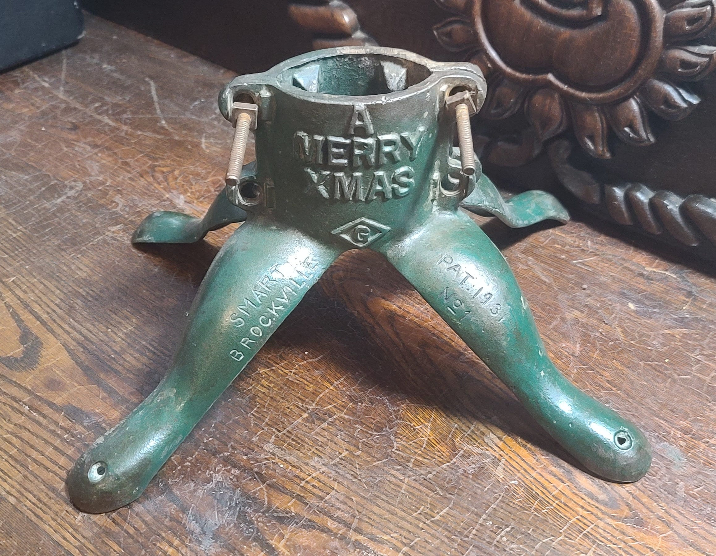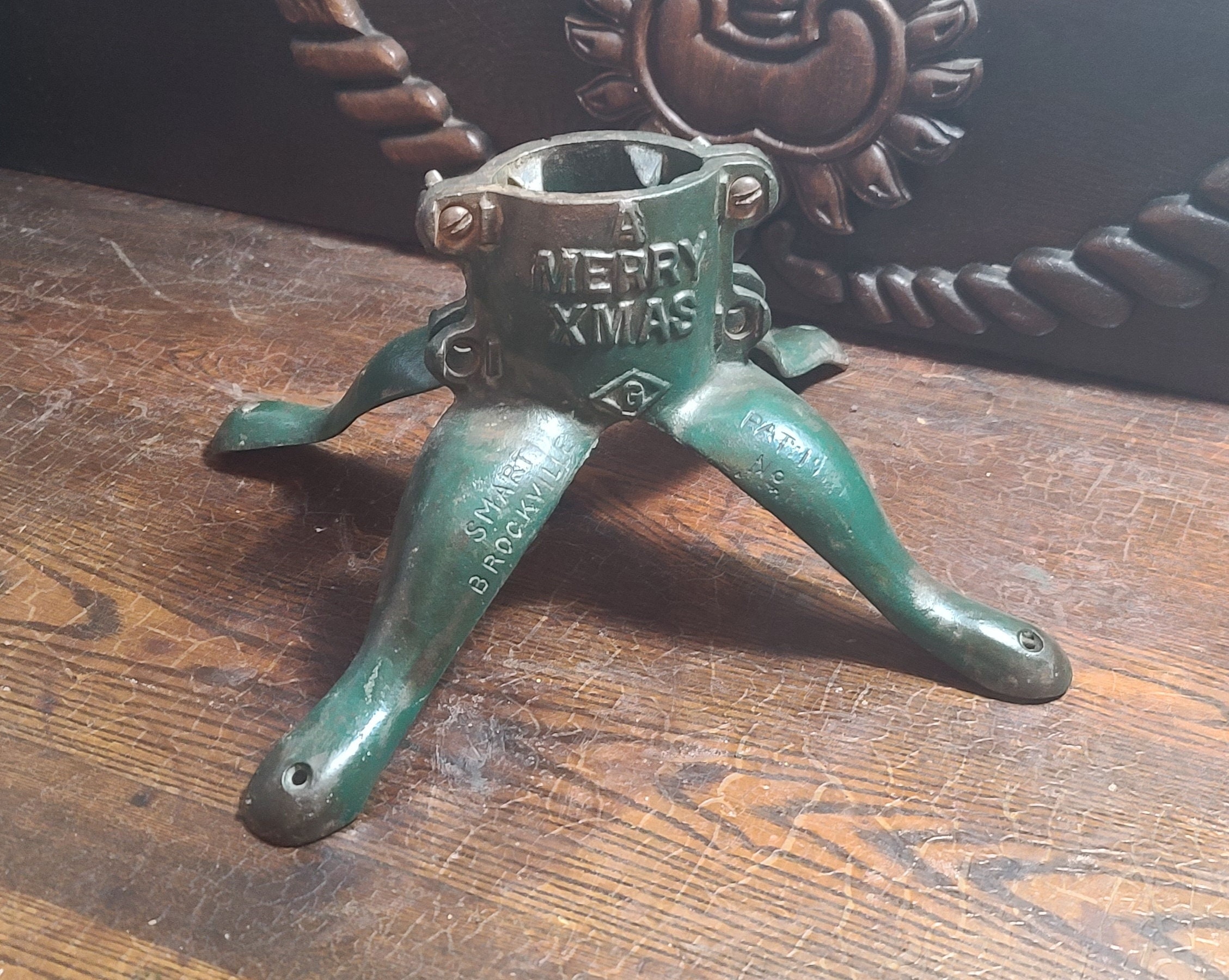 Vintage "A Merry Xmas" Cast Iron Christmas Tree Stand by Smarts of Brockville Ontario