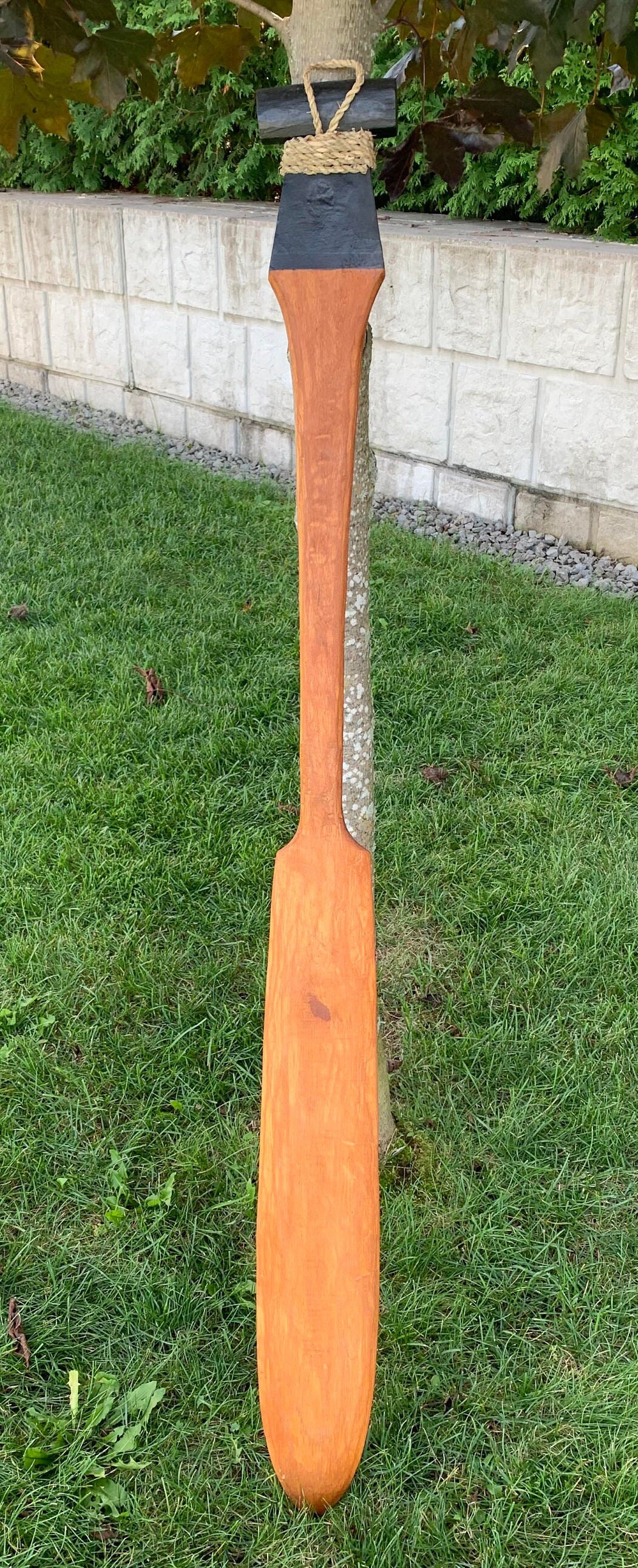 This paddle was more than likely carved and painted by an artisan in Indonesia and done in a manner to imitate a Haida paddle. It was not carved in Canadian cedar wood, but a similar overseas soft wood. Though not Canadian it is a beautiful paddle and is a cost effective option for decorating purposes. It would look amazing in a cottage, boat house, or even on the rec room wall.
