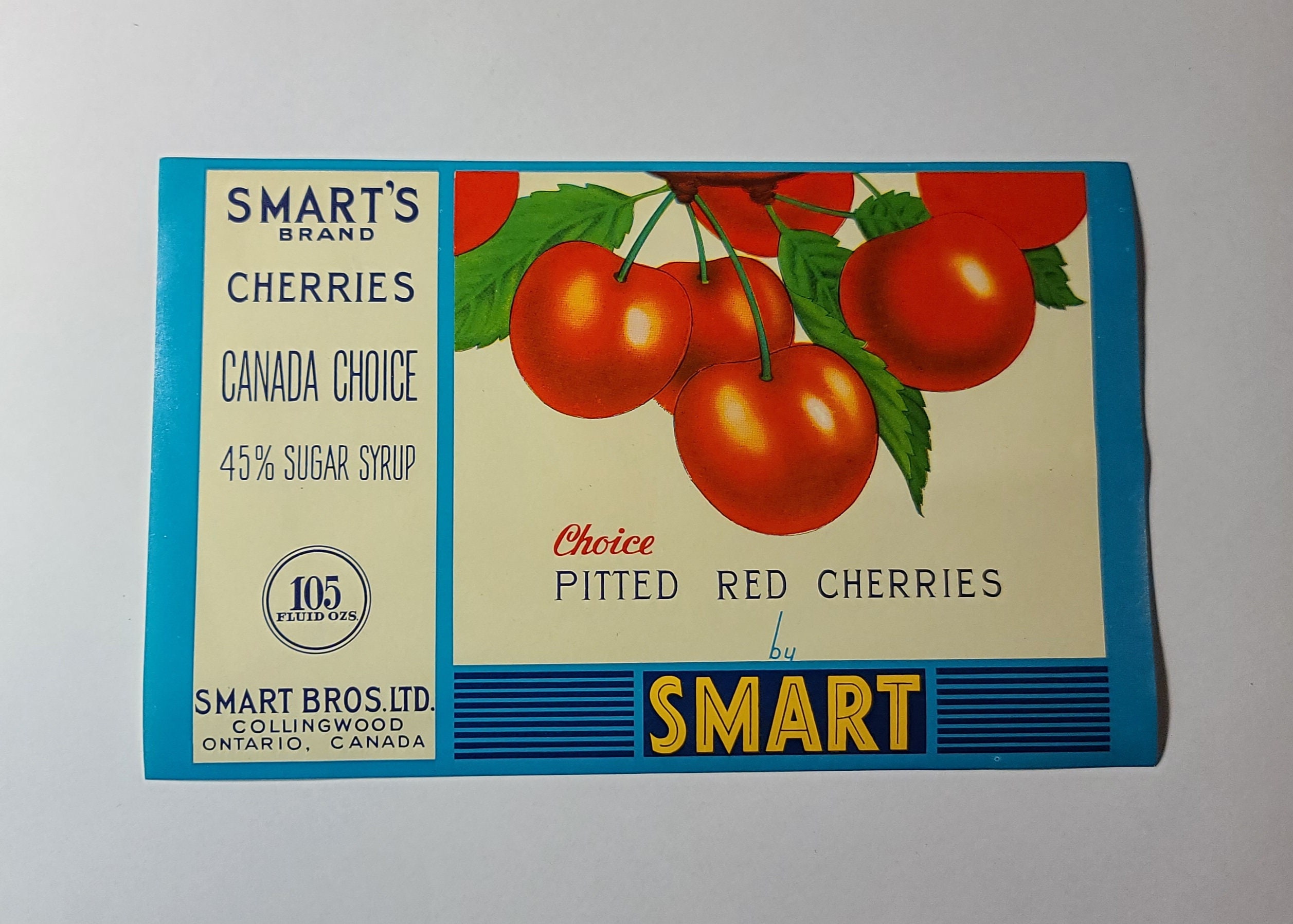 New Old Stock - 1960s Smart's Canned Food Label - Smart Bros. Ltd. Collingwood, Ontario, Canada - Choice Pitted Red Cherries