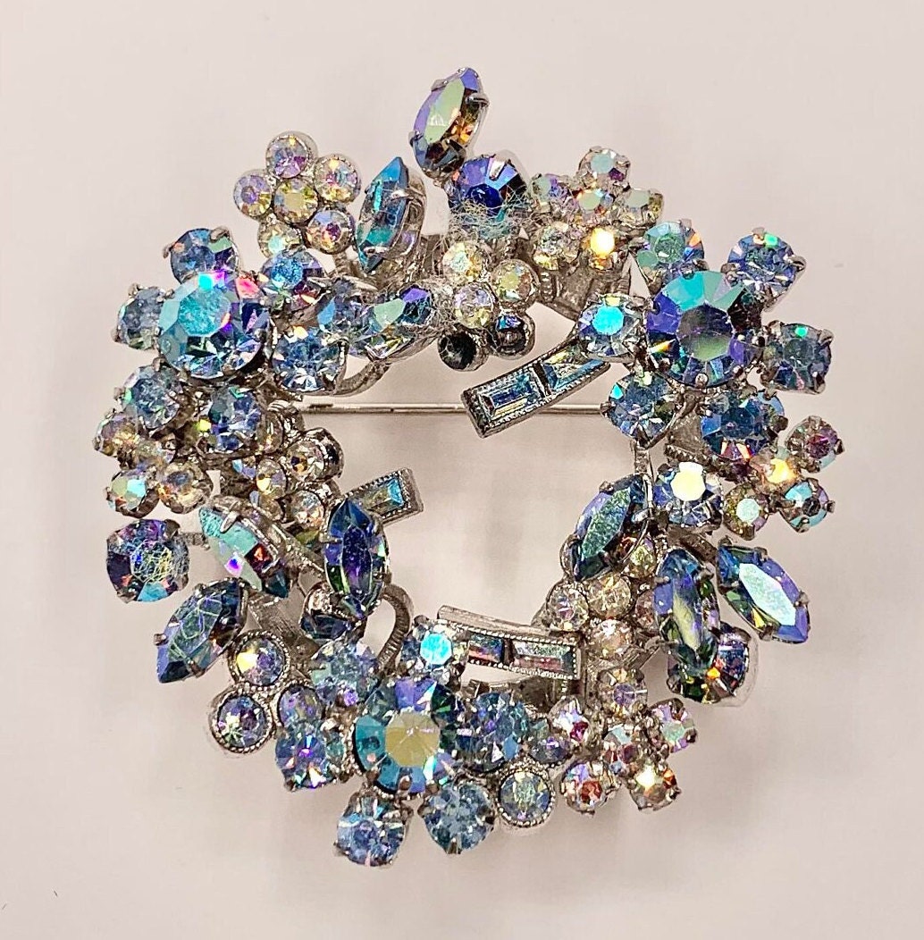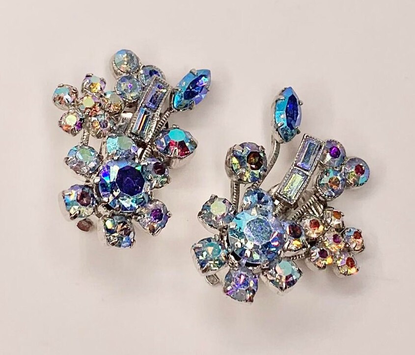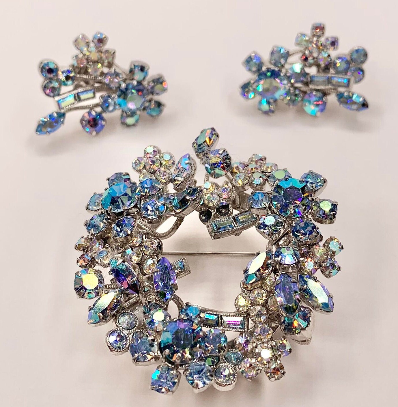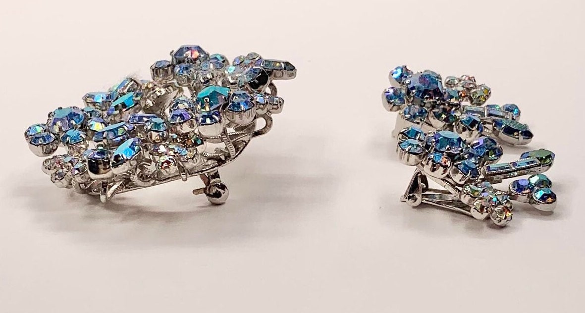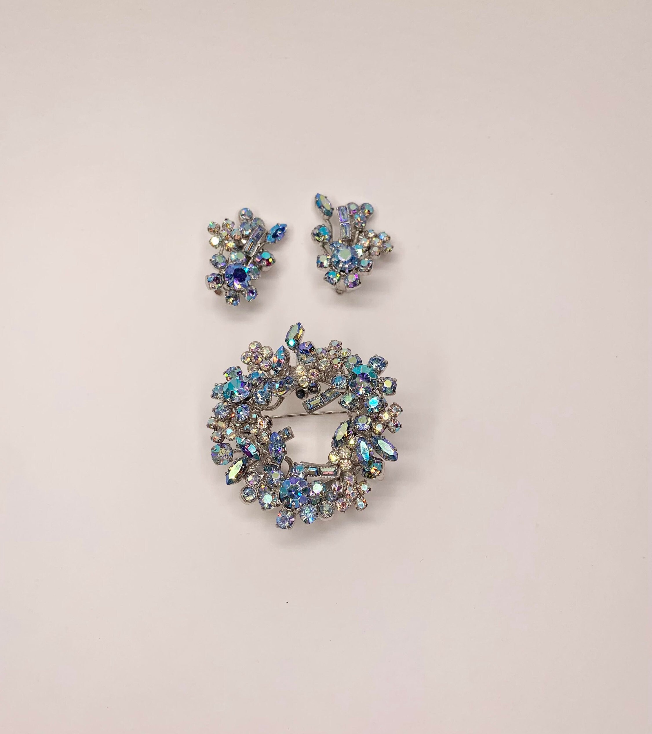 Vintage Triad Brooch and Clip on Earrings in Iridescent Blue