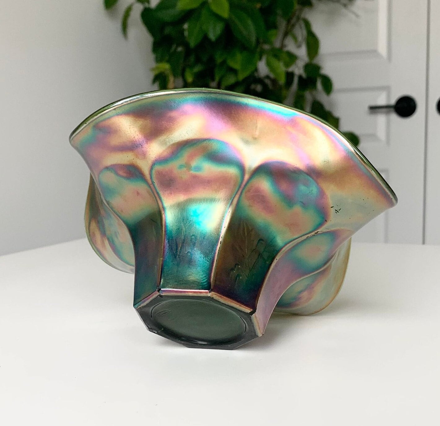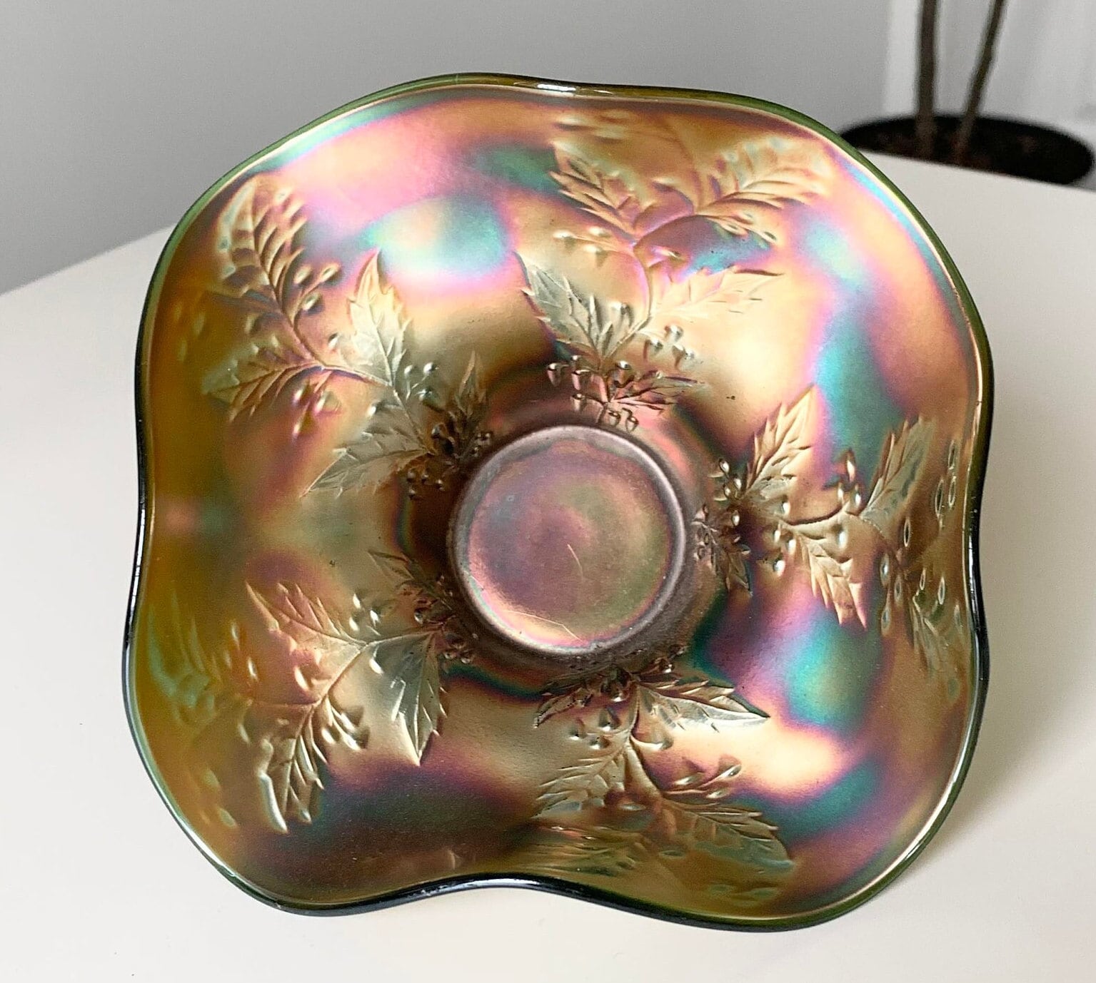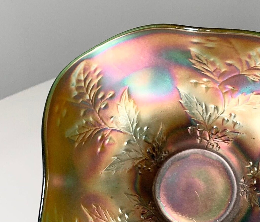 Amethyst Blue Iridescent Ruffled Carnival Glass Holly and Berry Dish