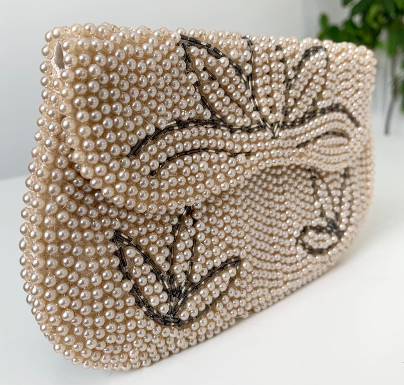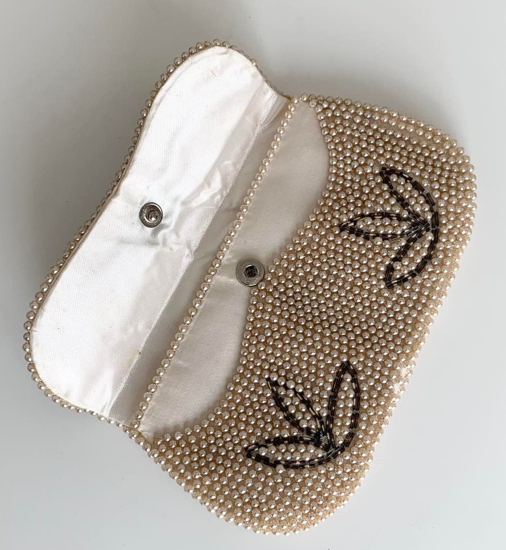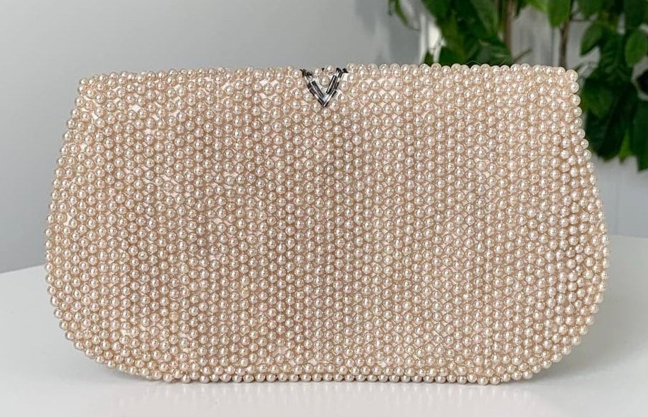 Clutch Purse Adorned in Faux Pearls, Satin Lined