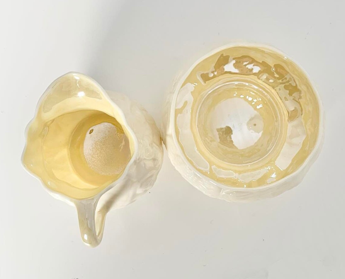 Item Measurements in Inches: creamer 3" tall, sugar dish approx. 2" tall x 4