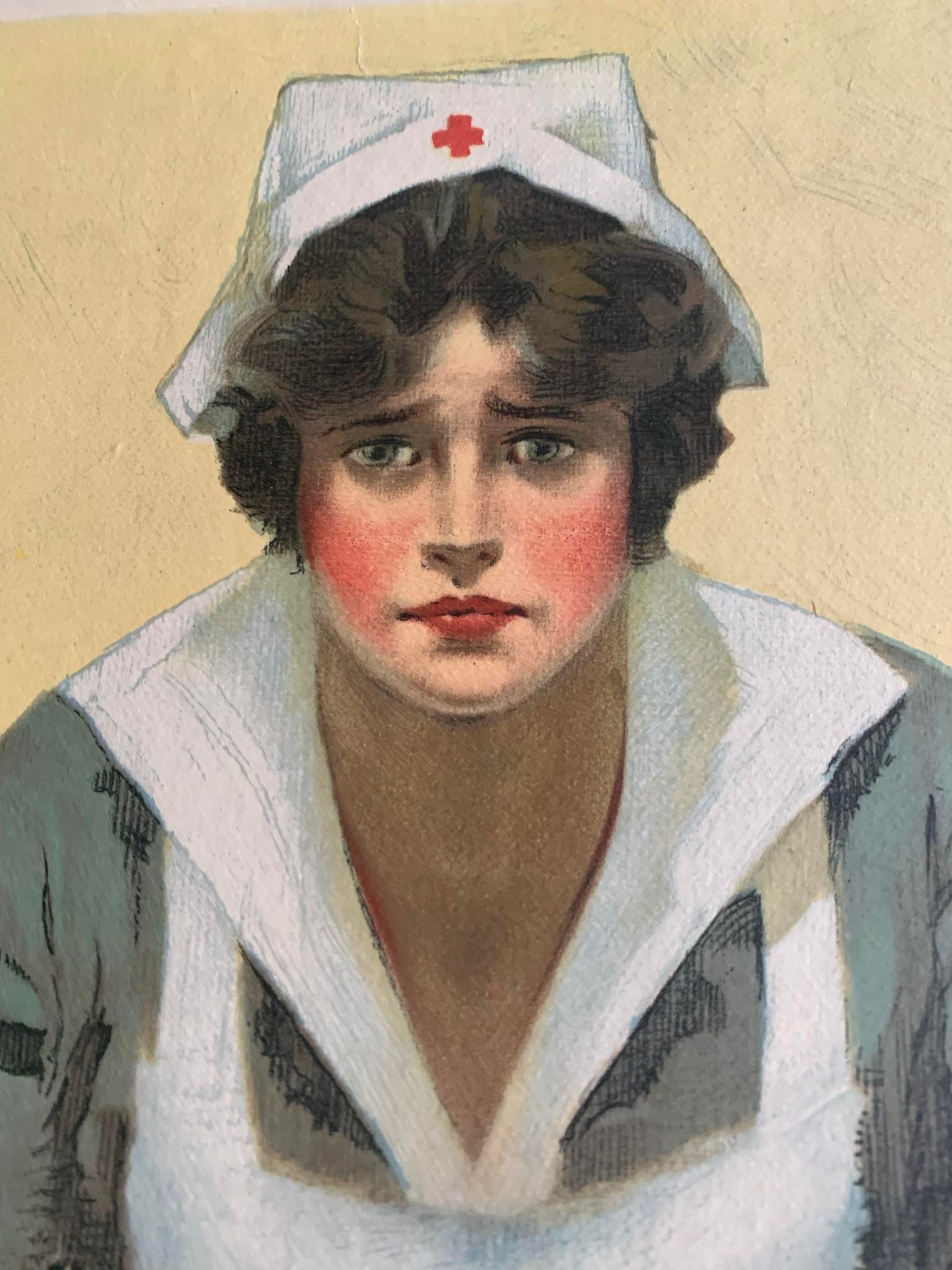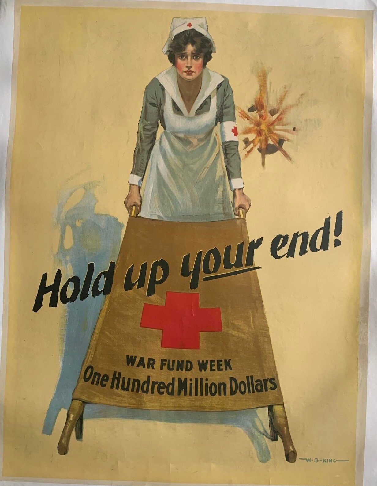 Poster seeks contributions for war relief efforts, particularly for nurses (American Red Cross). The Government refused to grant military nurses commissioned rank and benefits until after WW2. The artist is W. B. King (1880-1927). Signed, by artist at lower right of illustration.