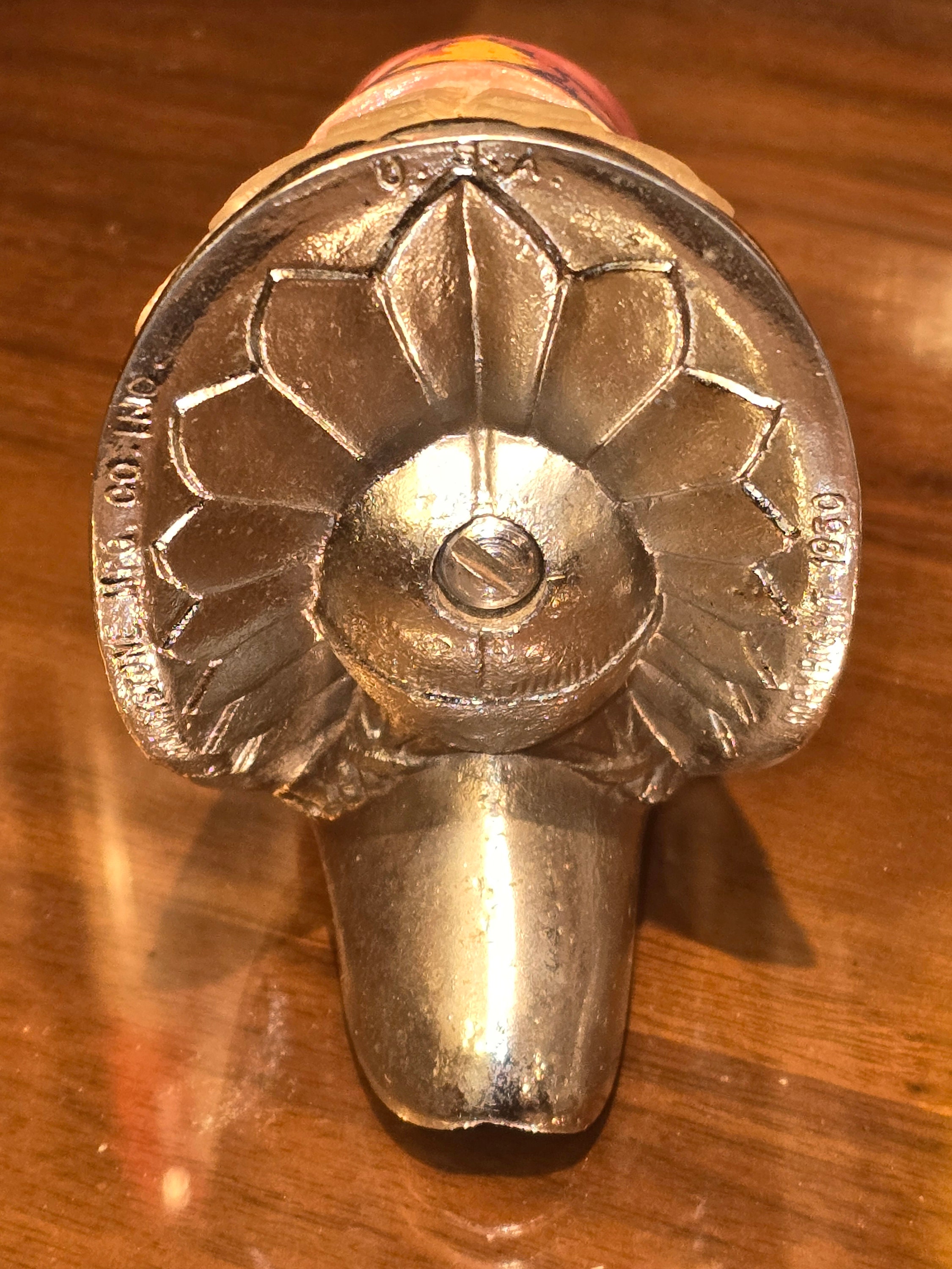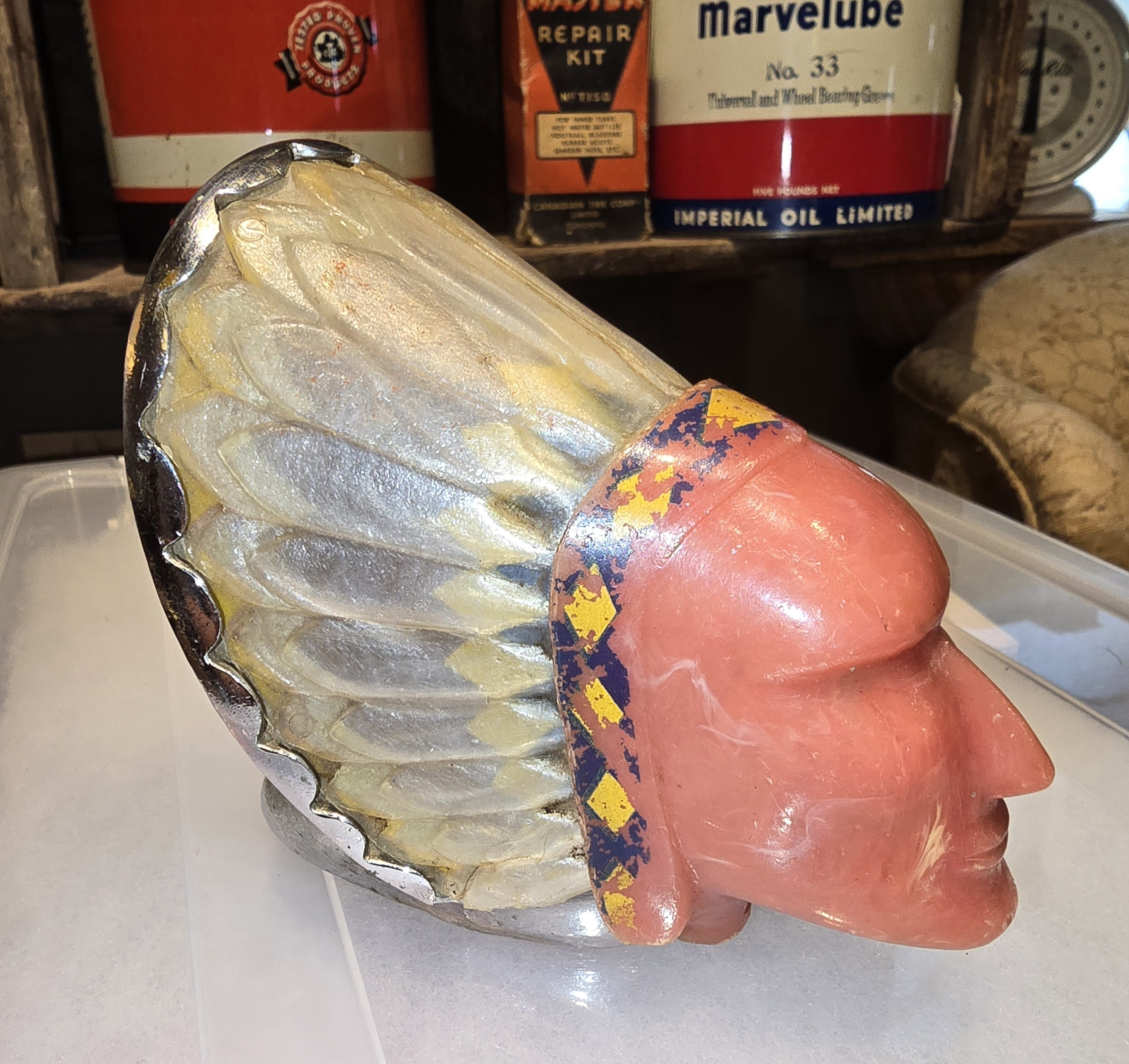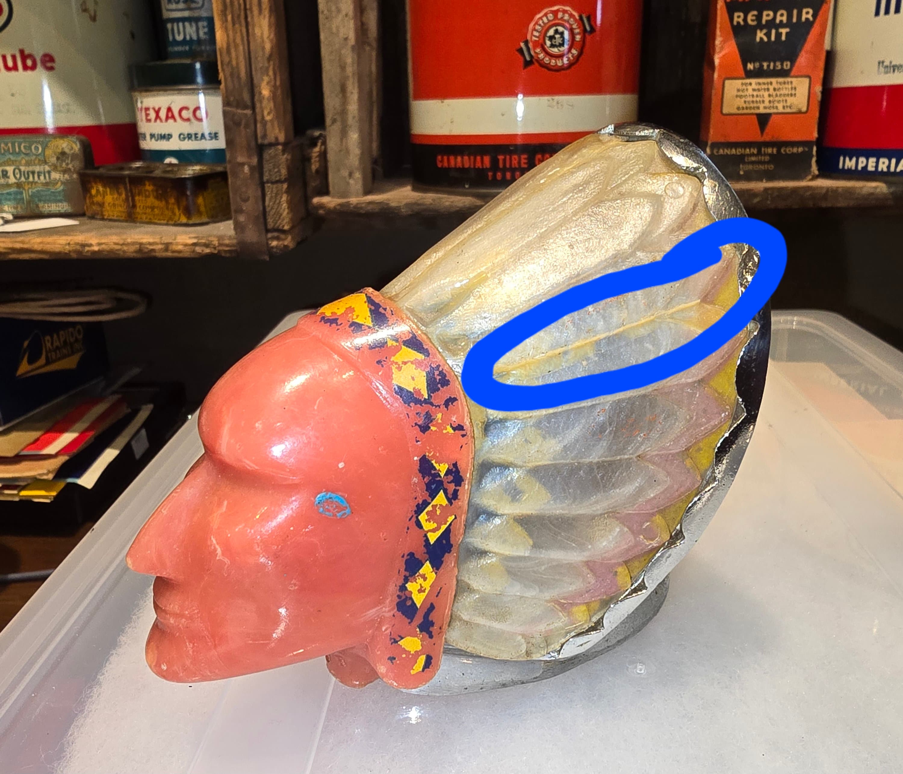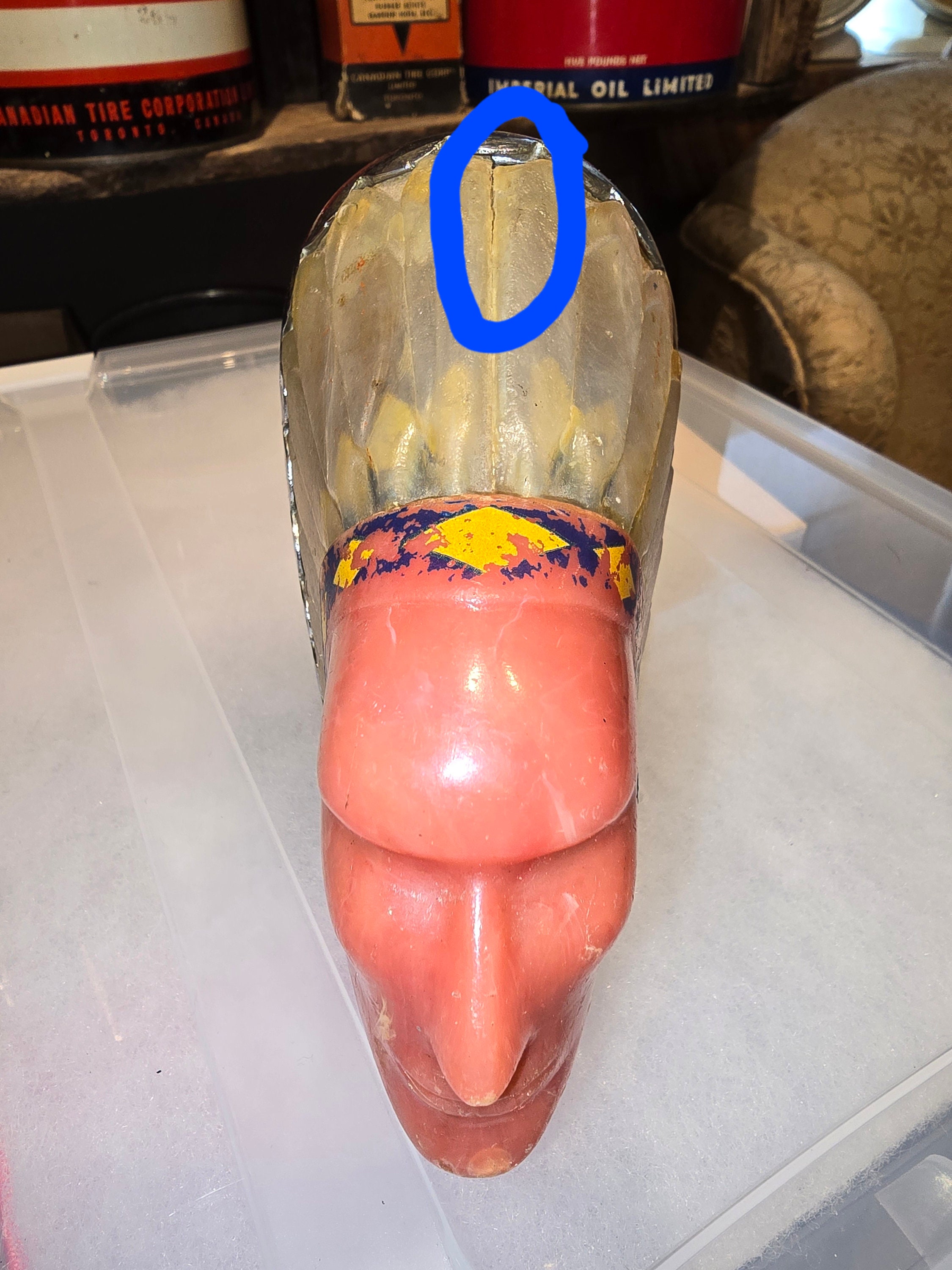 Condition: solid vintage piece. One spot of blue paint on the one side, wear to headdress paint, three stress cracks, and no box