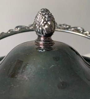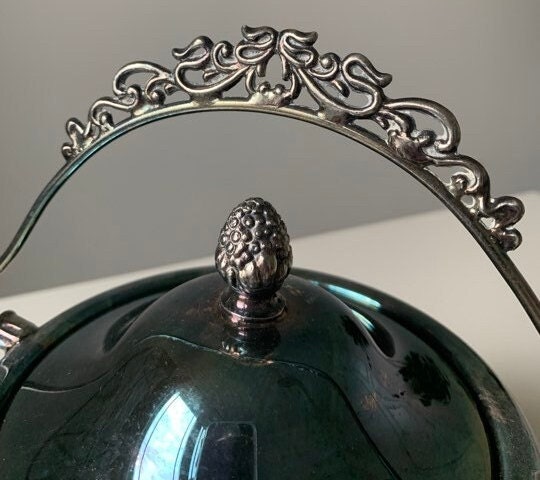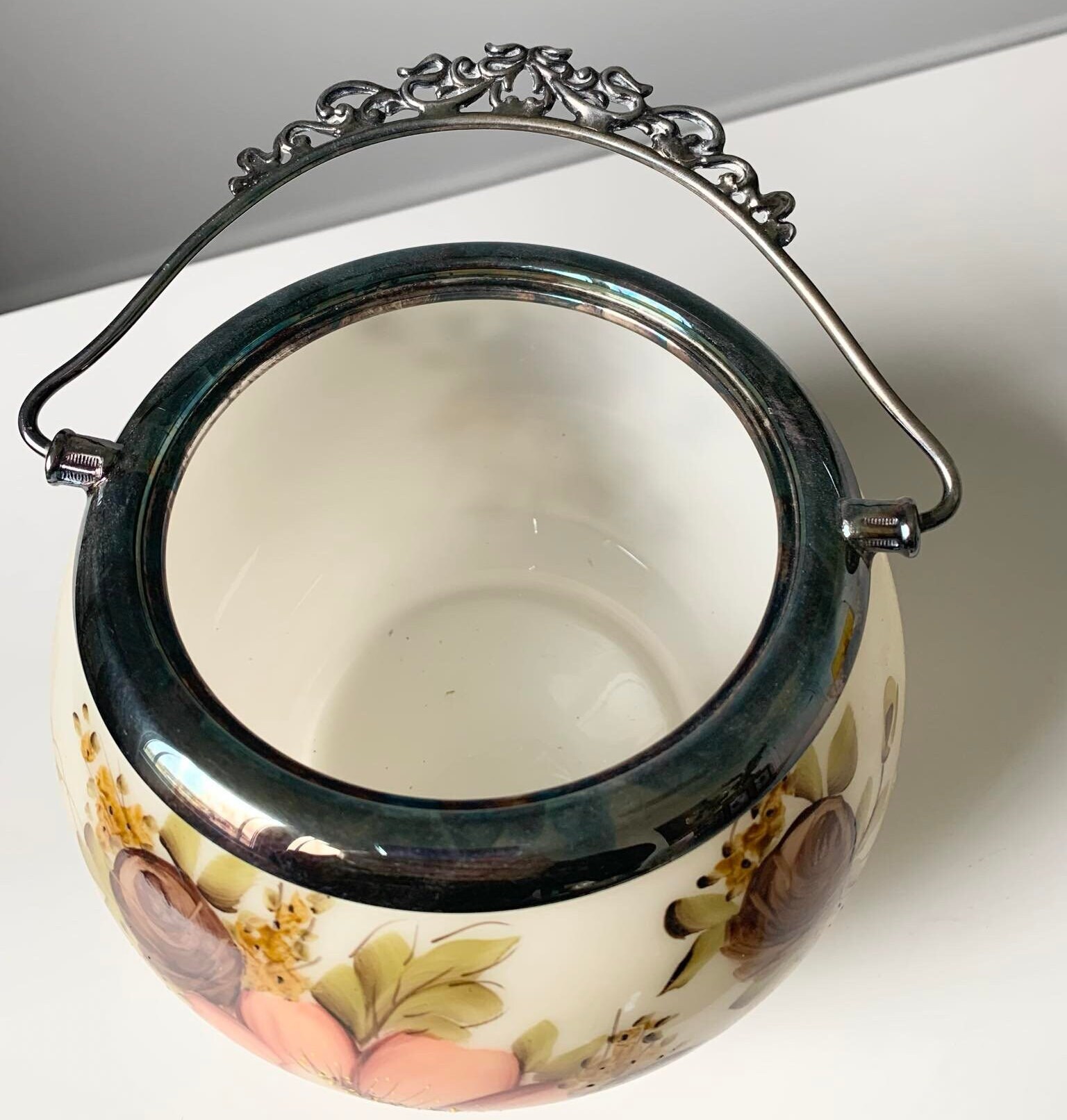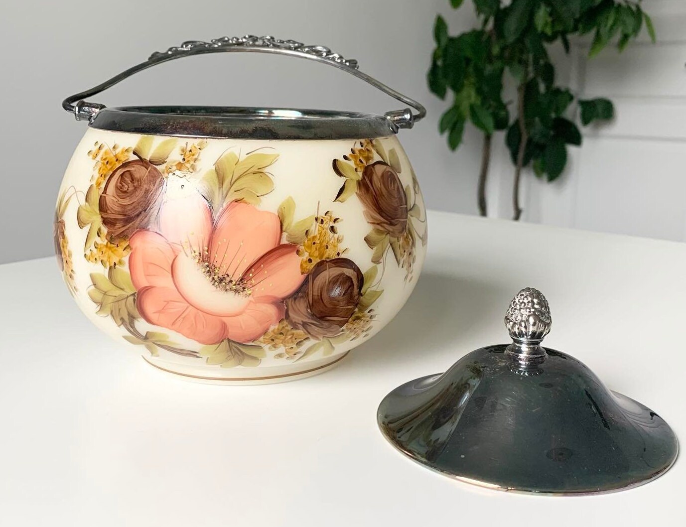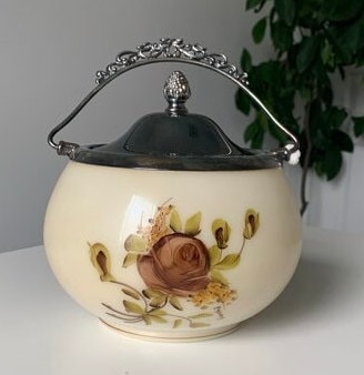 Antique Hand Painted Floral Biscuit Barrel with Silver Handle and Lid by Wm A. Rogers