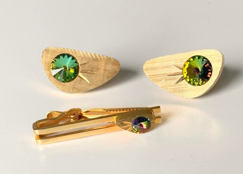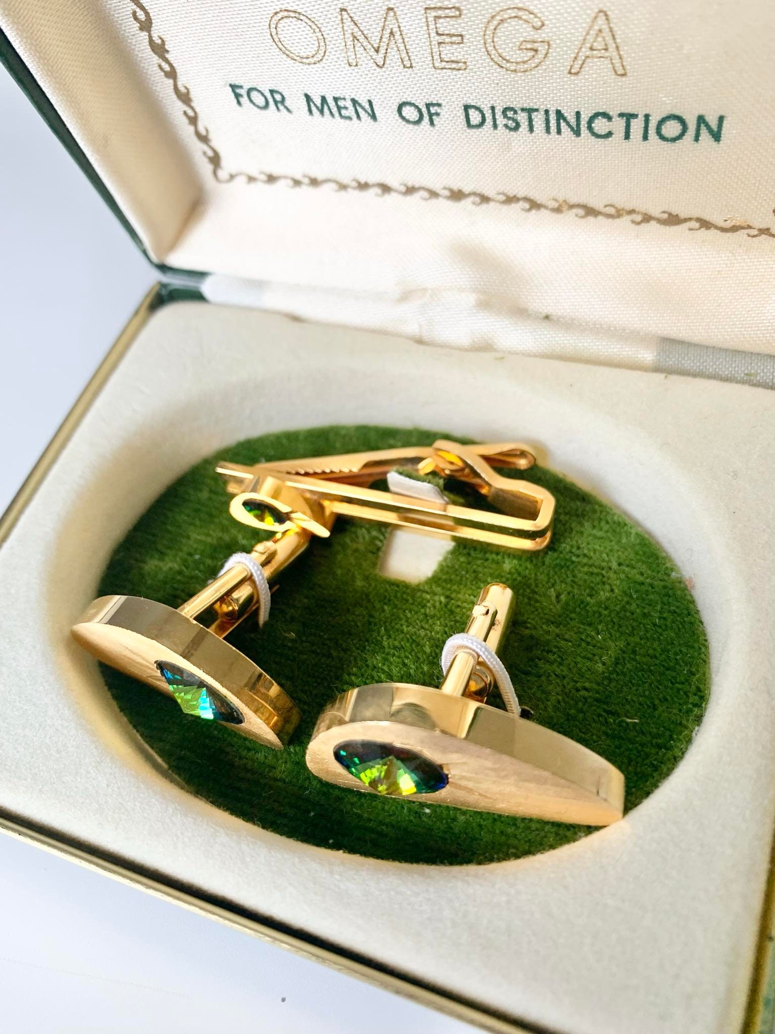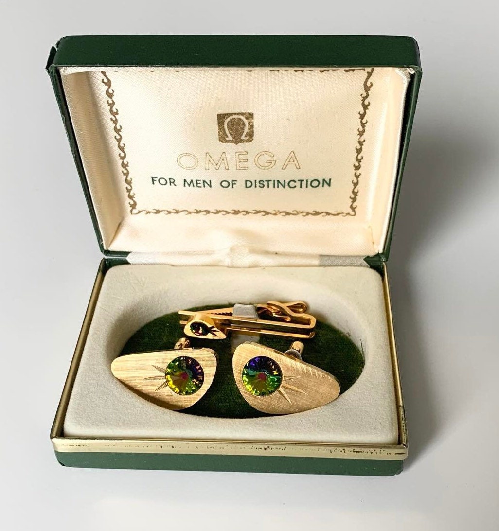 Omega Crystal Cufflinks and Tie Clip Goldtone Set in Original Box