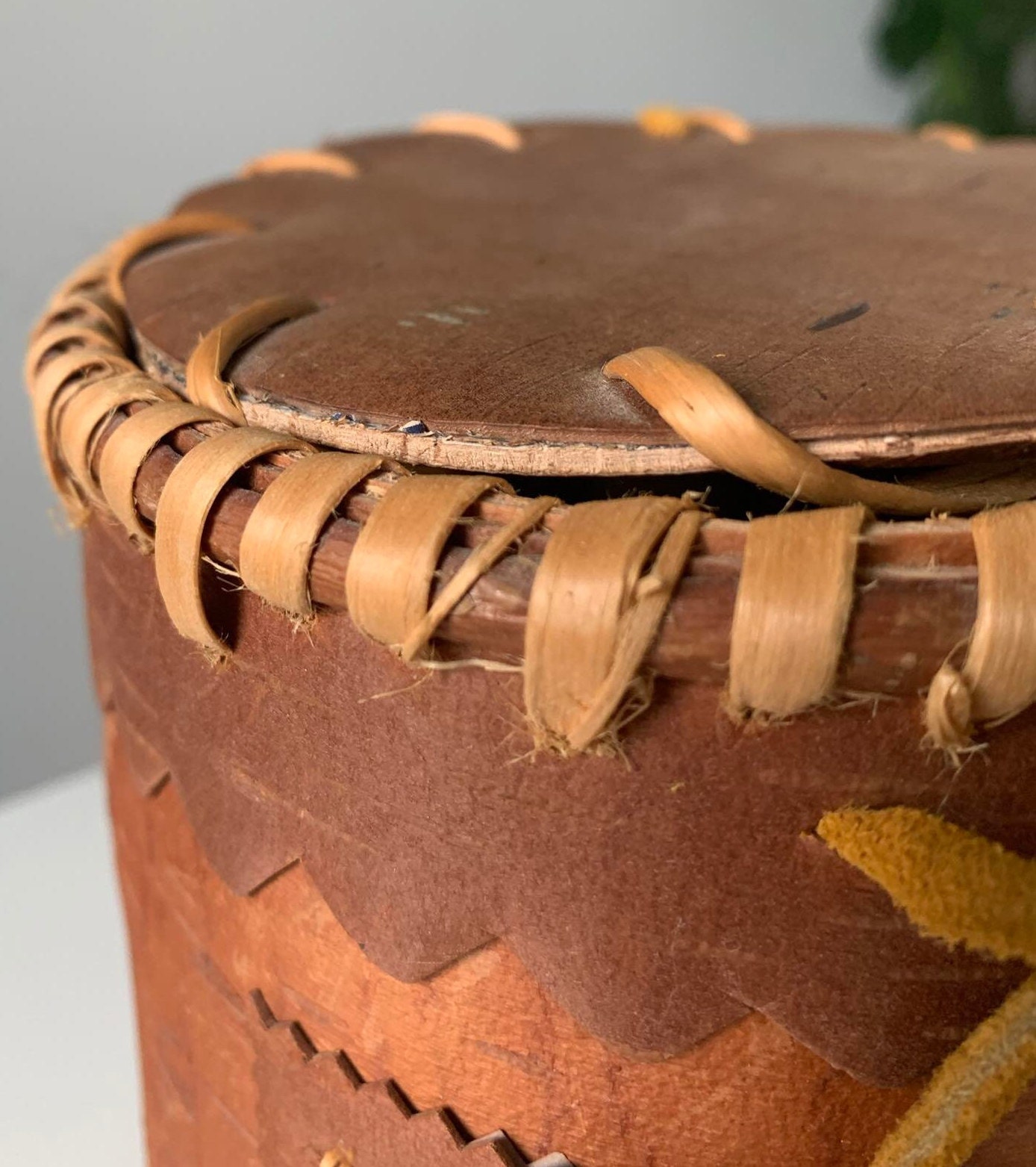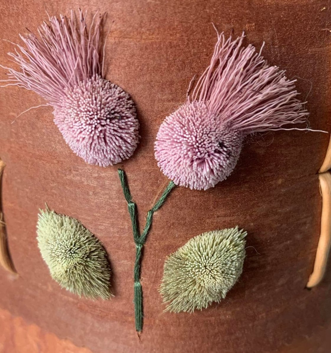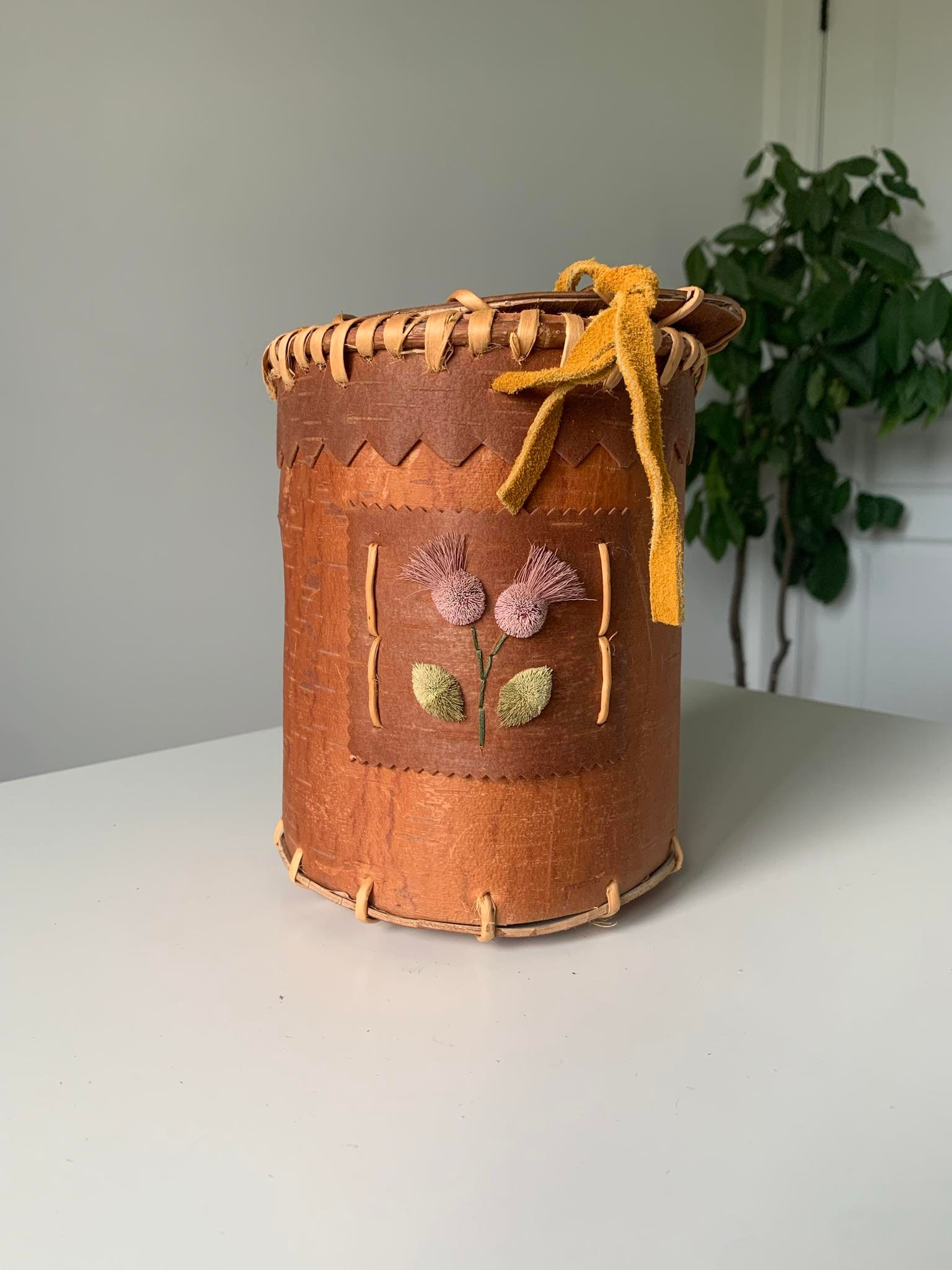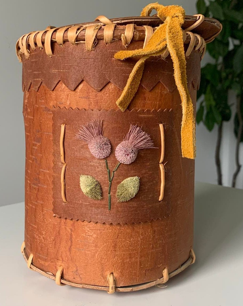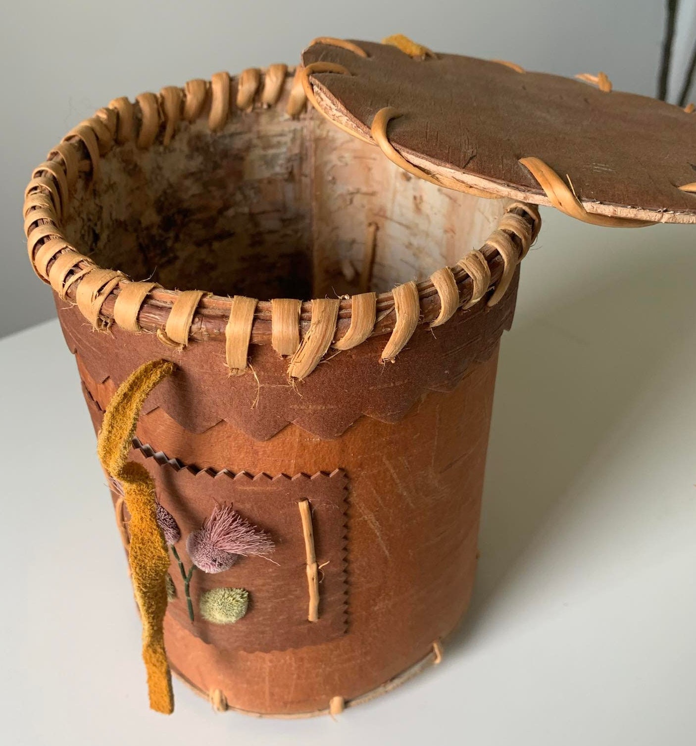 Indigenous Birchbark Container with Tufted Moose Hair Flowers signed by Artist - Dolly Metchooyeah of the Dene Tha First Nation