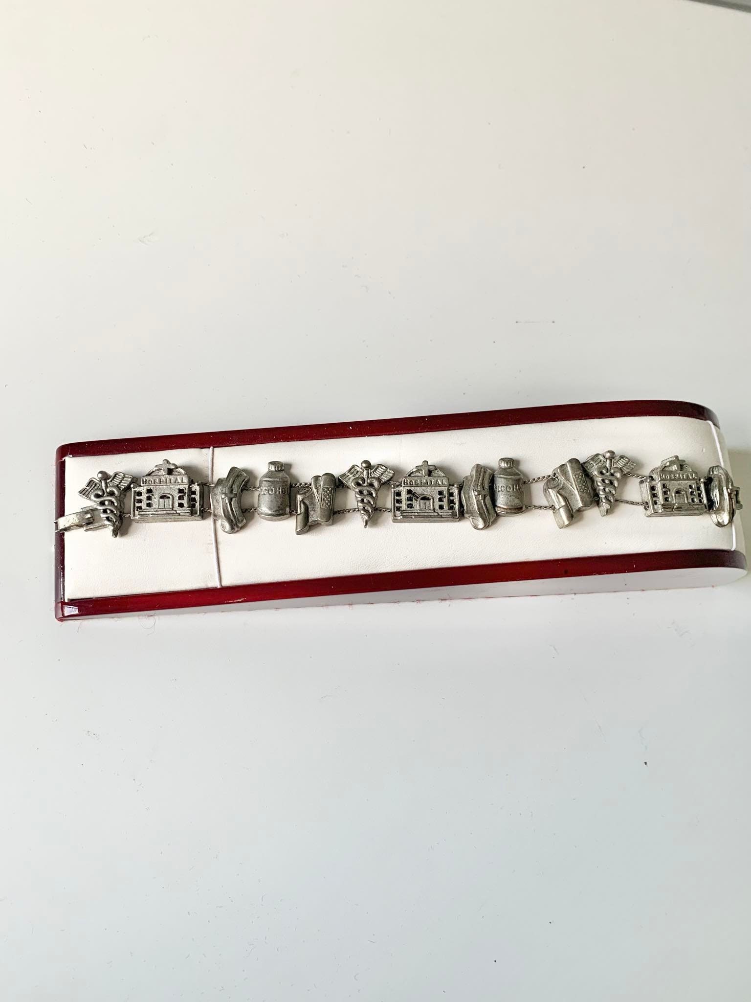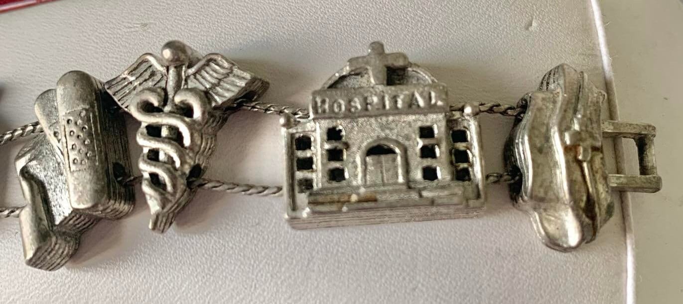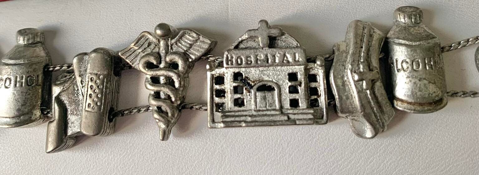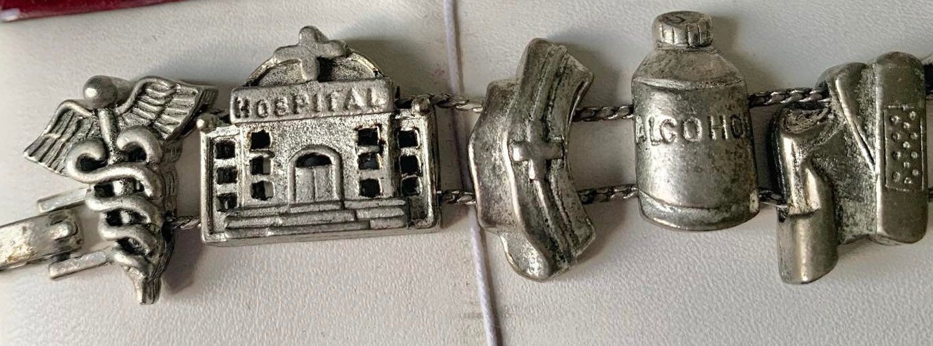 Features the caduceus, hospital, nurses cap, rubbing alcohol, bandages, repeat x 3