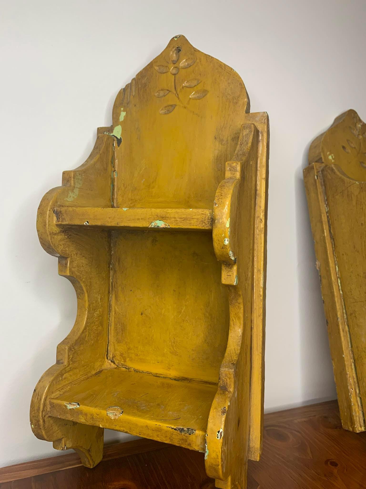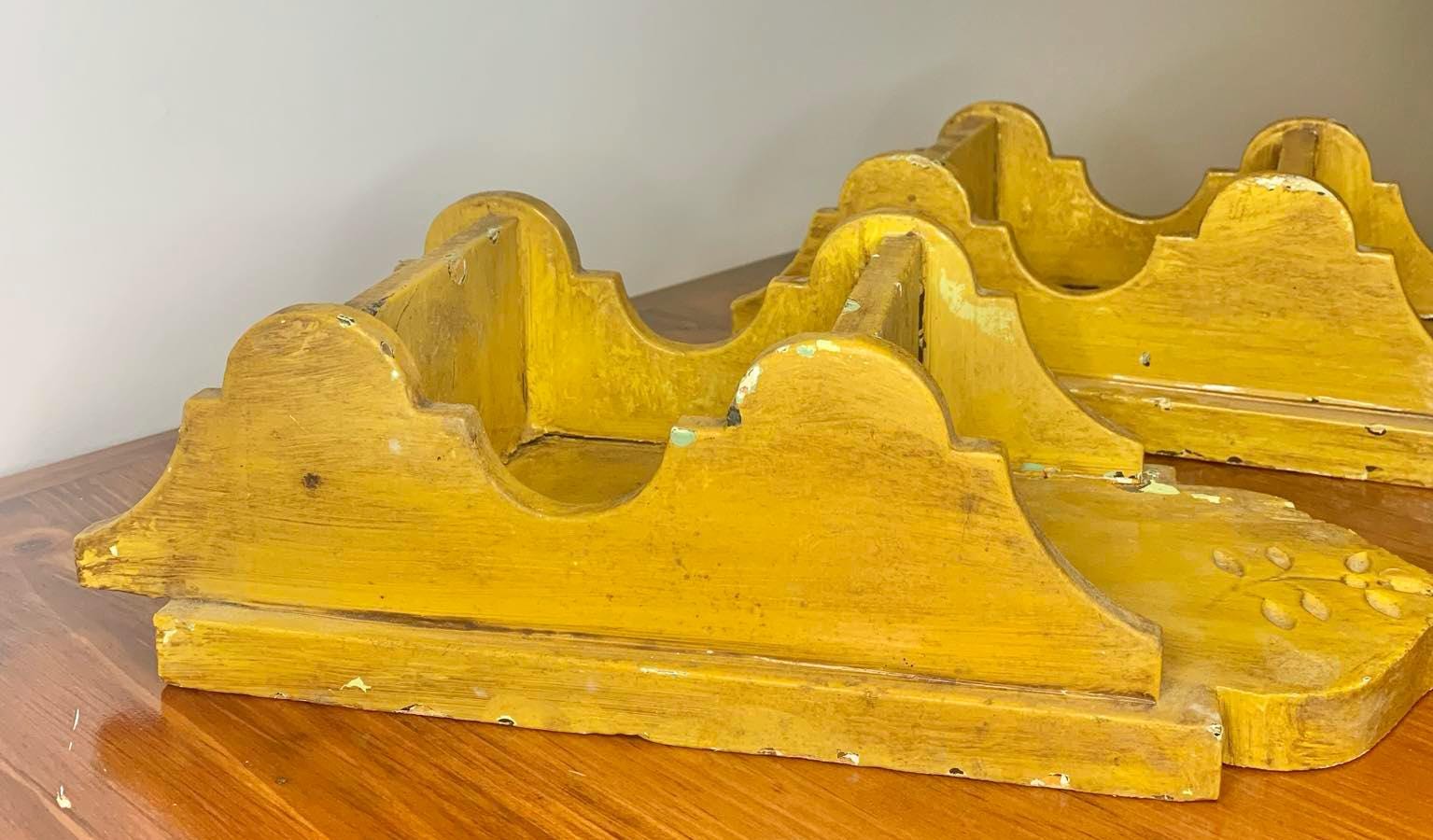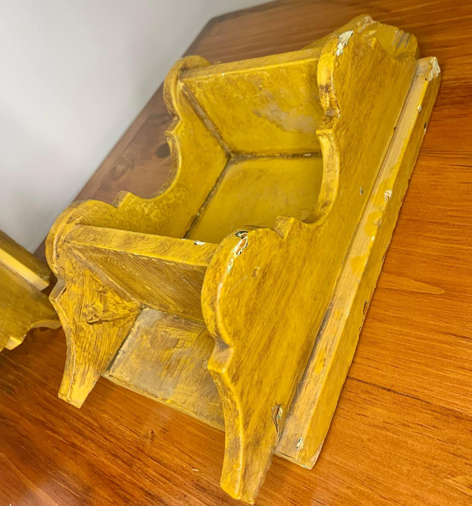 Matching Pair of Primitive Canadian Wooden Shelves with Heavy Mustard Color Over-Paint