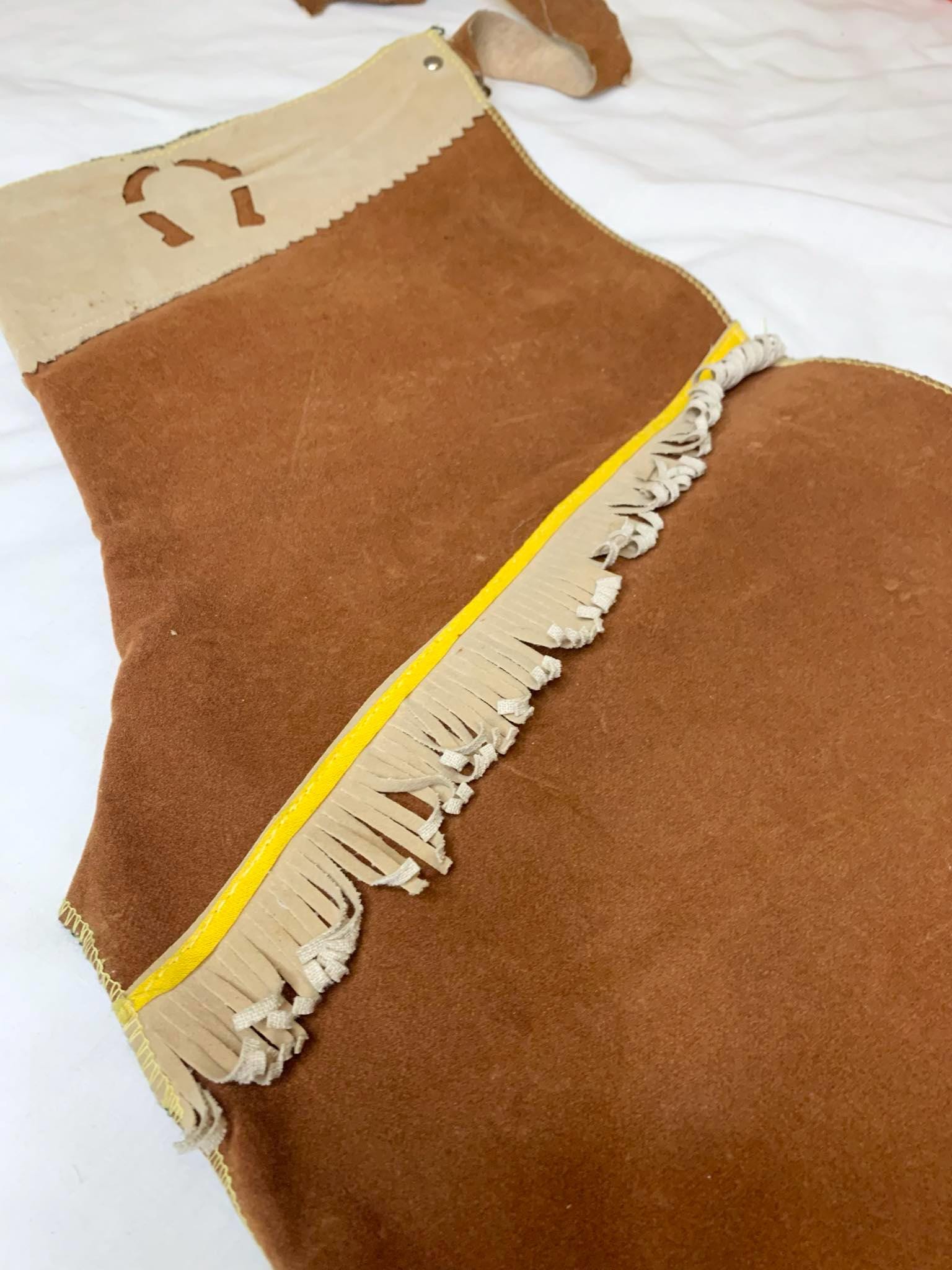 Condition: Small tear inside leg of chaps as seen in last photo. Easily repaired.