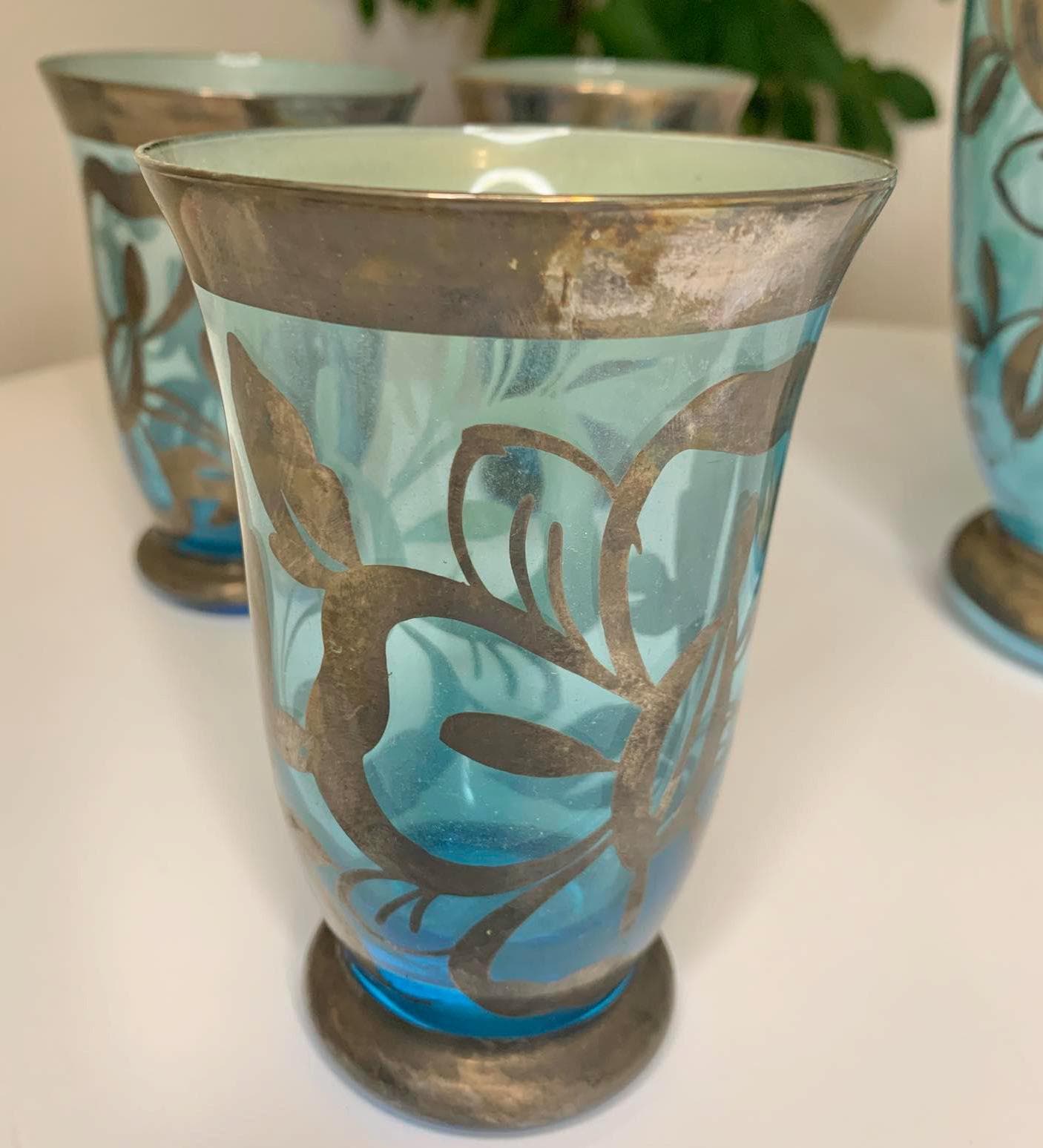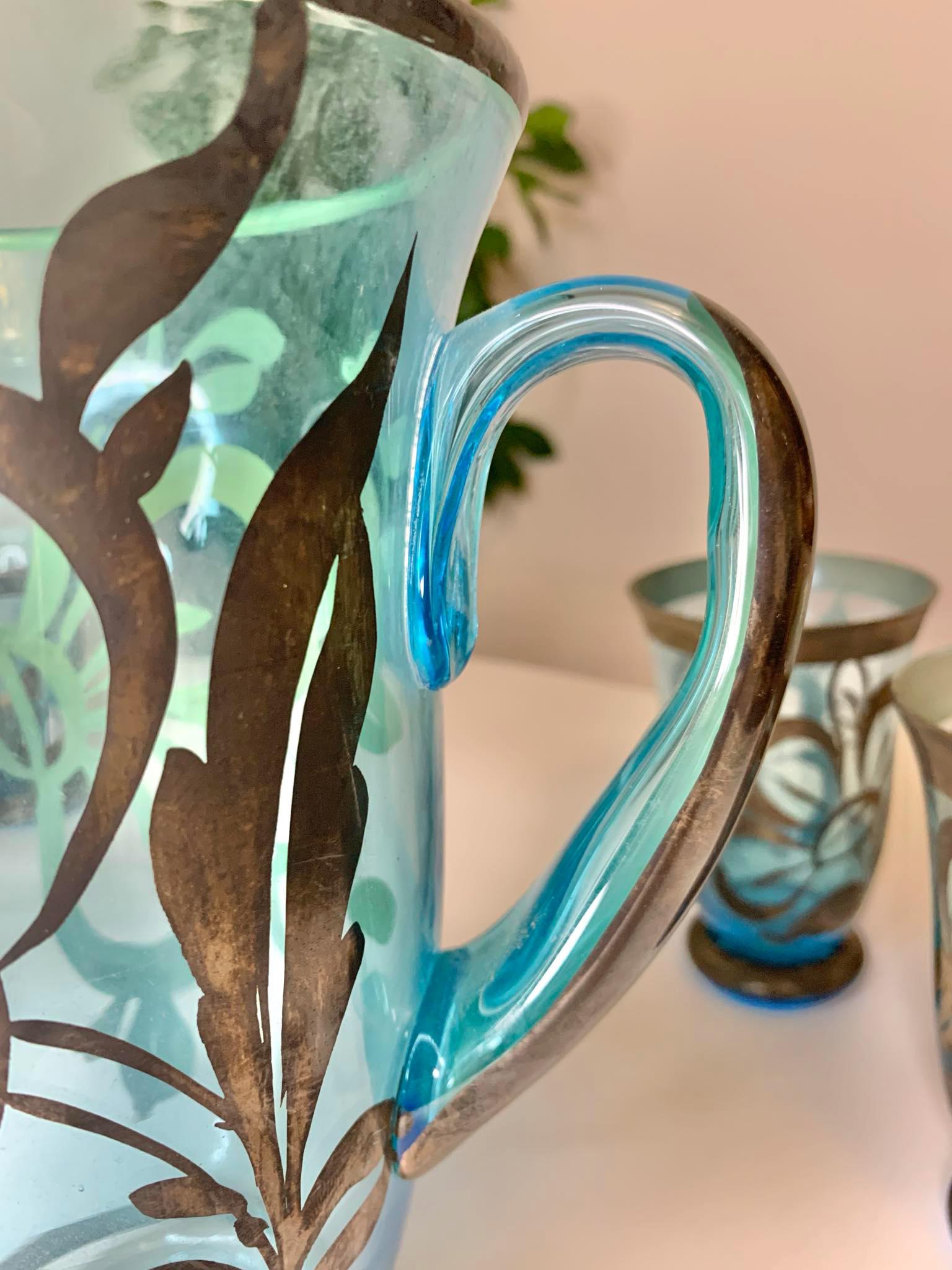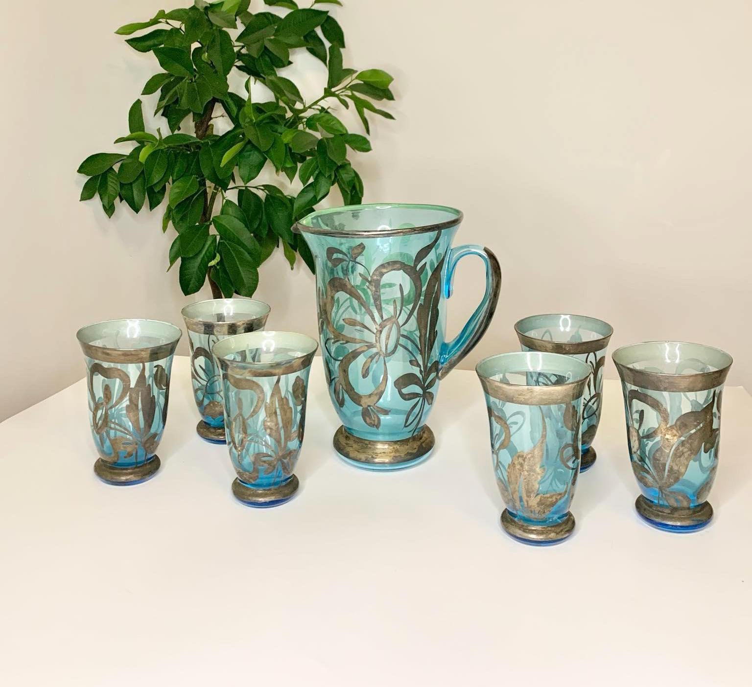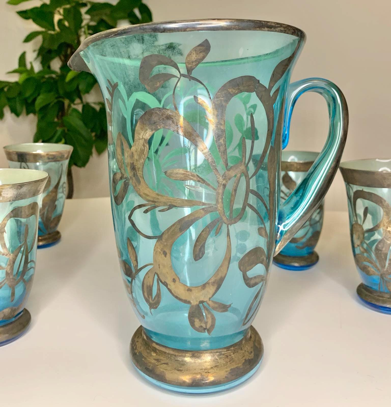 Vintage Bohemian Czech Glass Pitcher and 6 Glasses with Silver Overlay