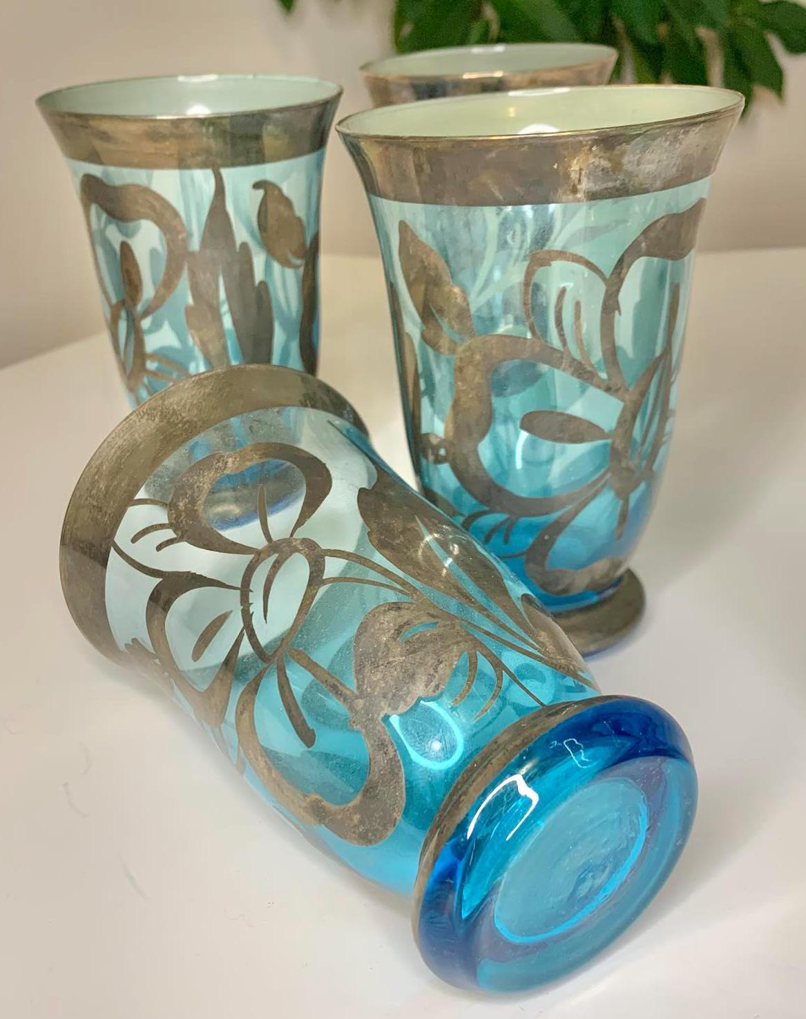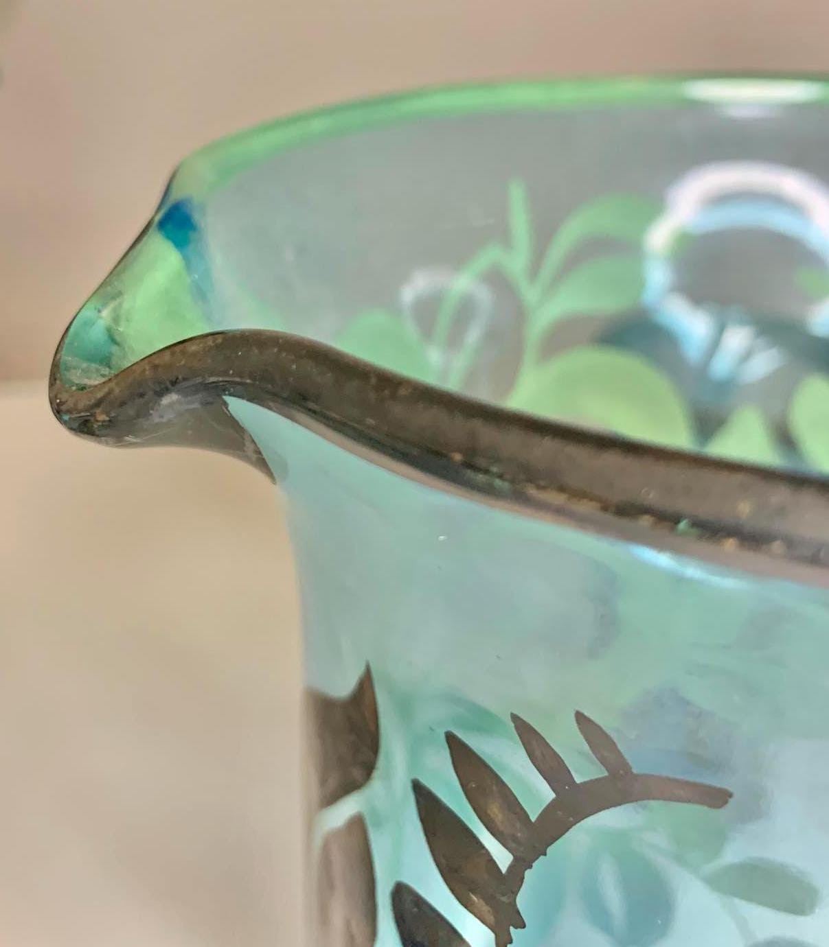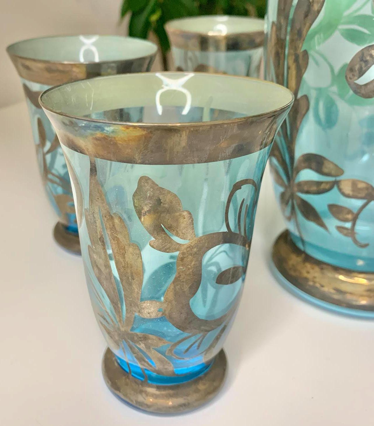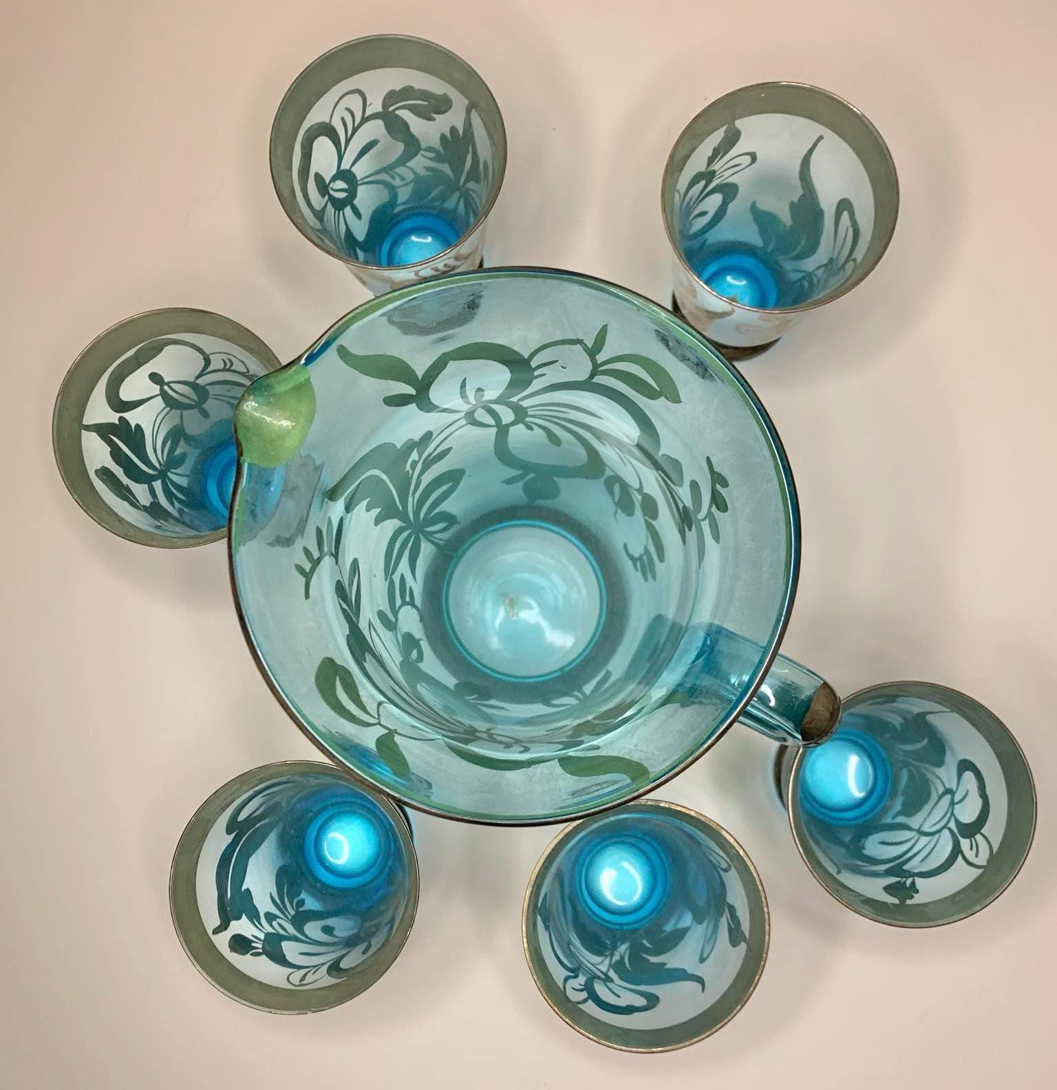 Vintage Bohemian Czech Glass Pitcher and 6 Glasses with Silver Overlay