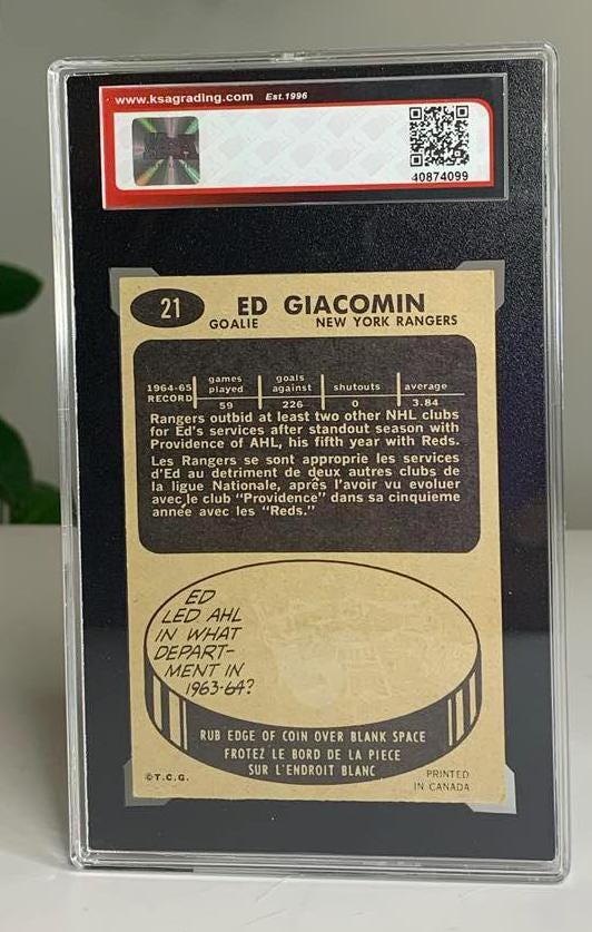 1965-66 TOPPS #21 Ed Giacomin New York Rangers Rookie Hockey Card