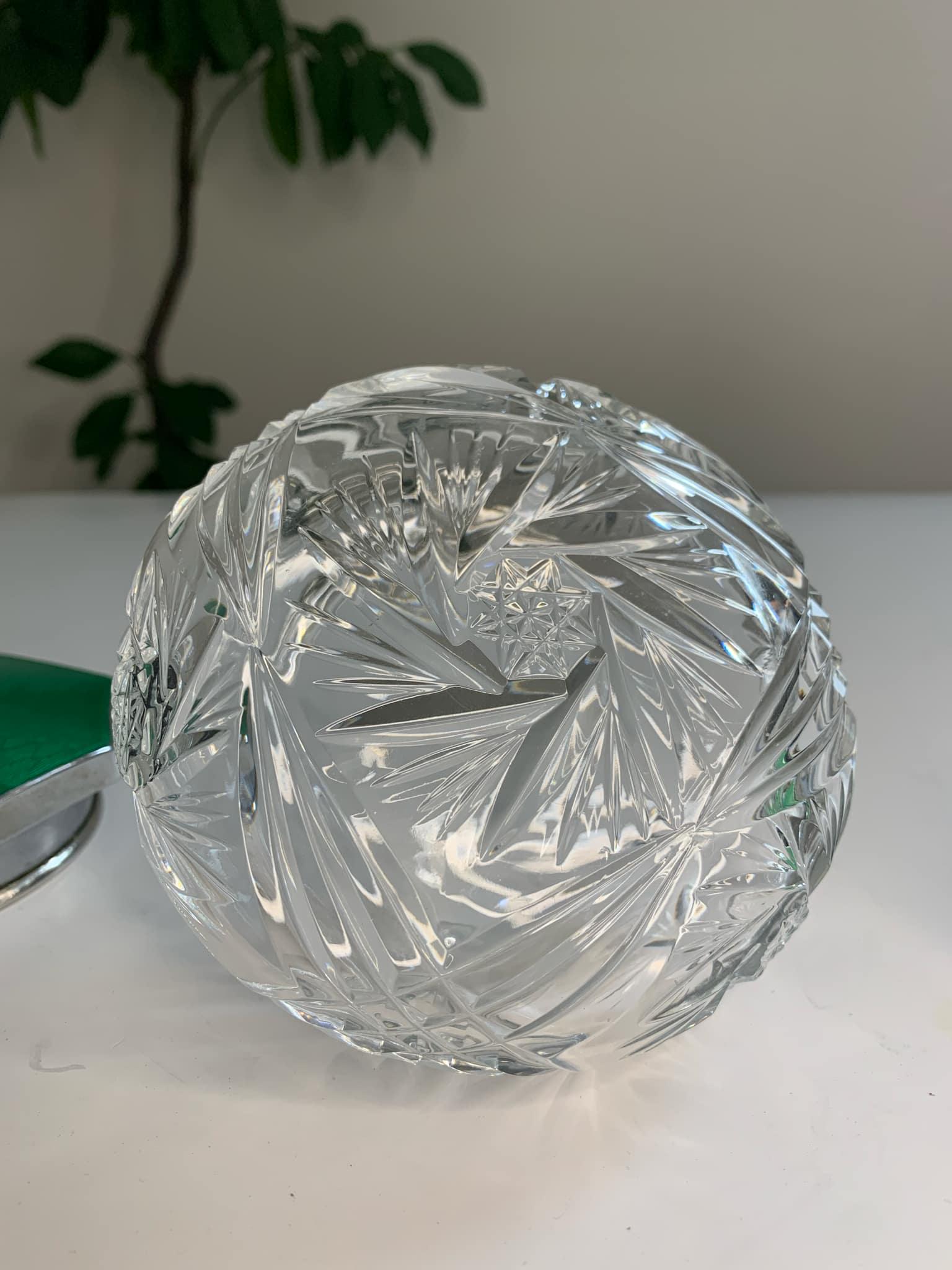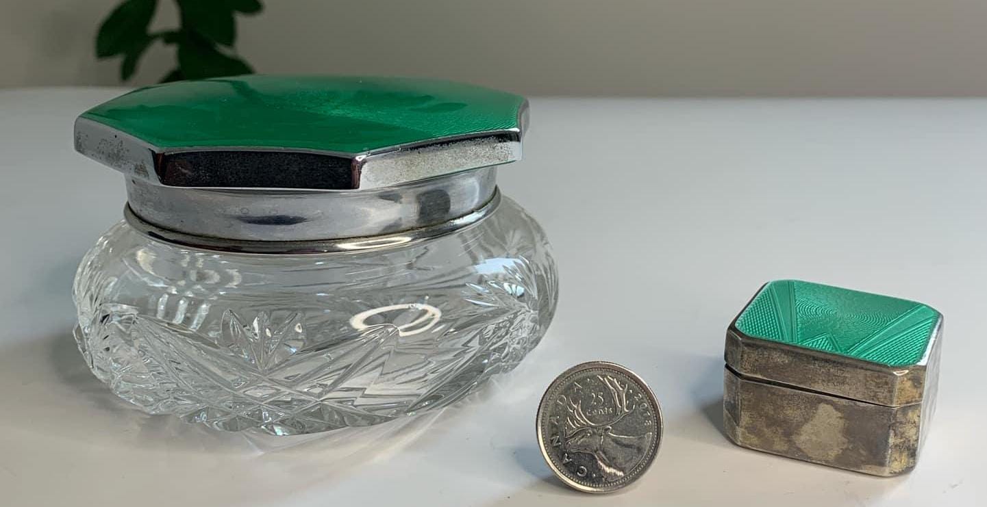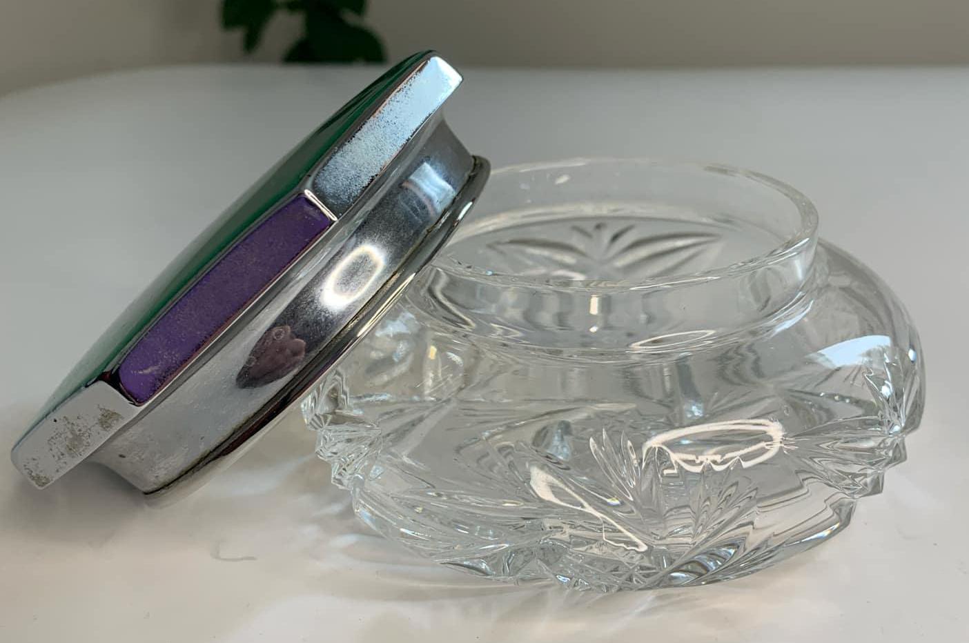 Please note that the ring box is sterling silver, but the dresser jar is crystal with a stainless steel lid.