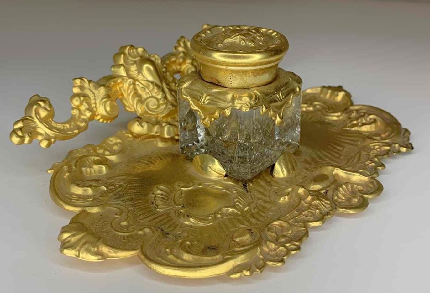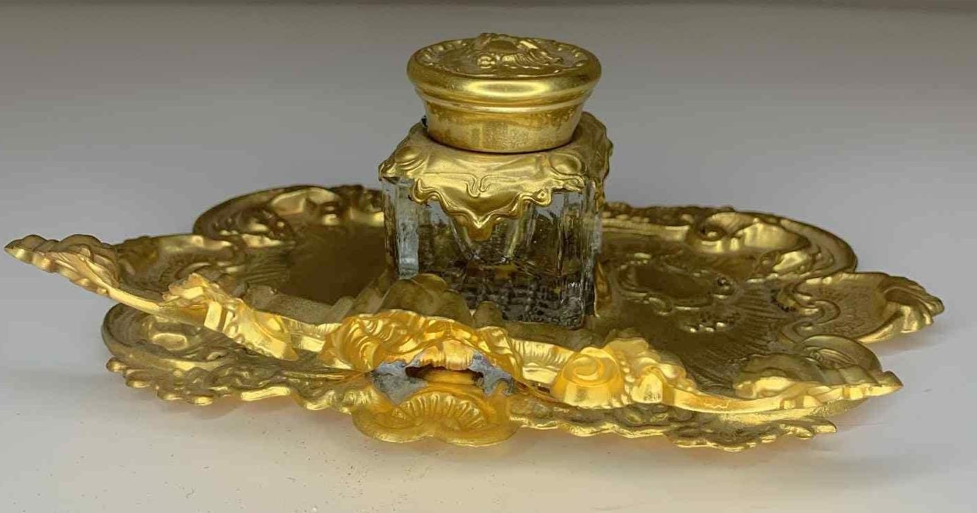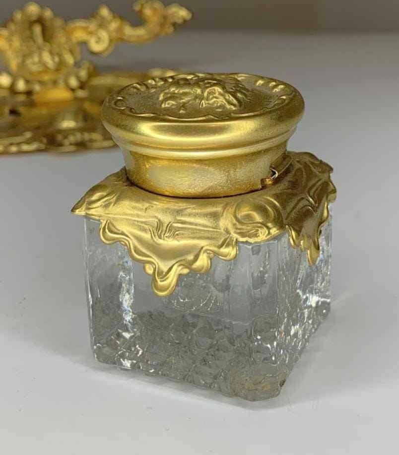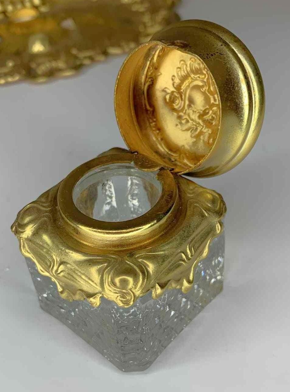 Ornate Gold-Toned Pressed Tin Ink Well With Glass Well