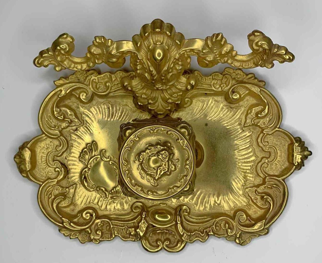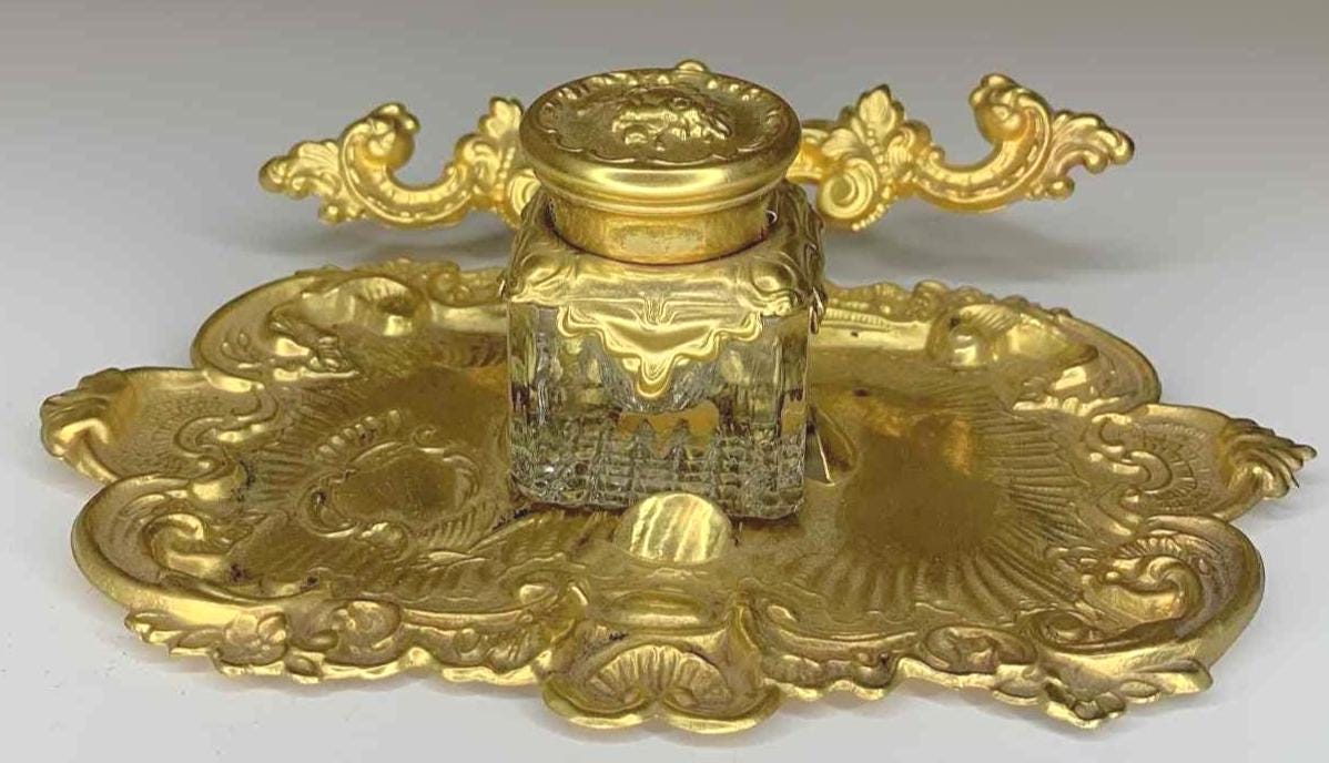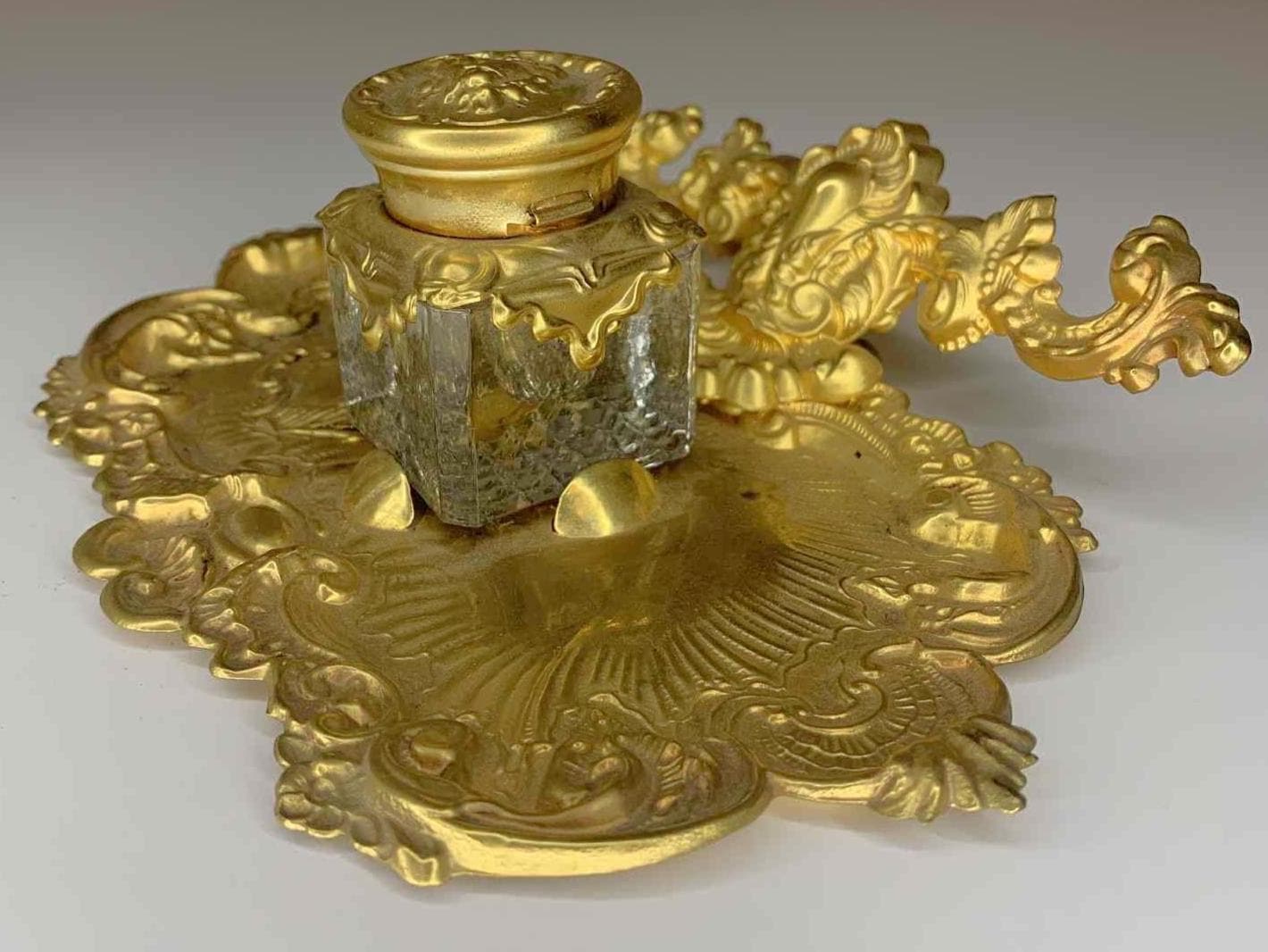 Ornate Gold-Toned Pressed Tin Ink Well With Glass Well
