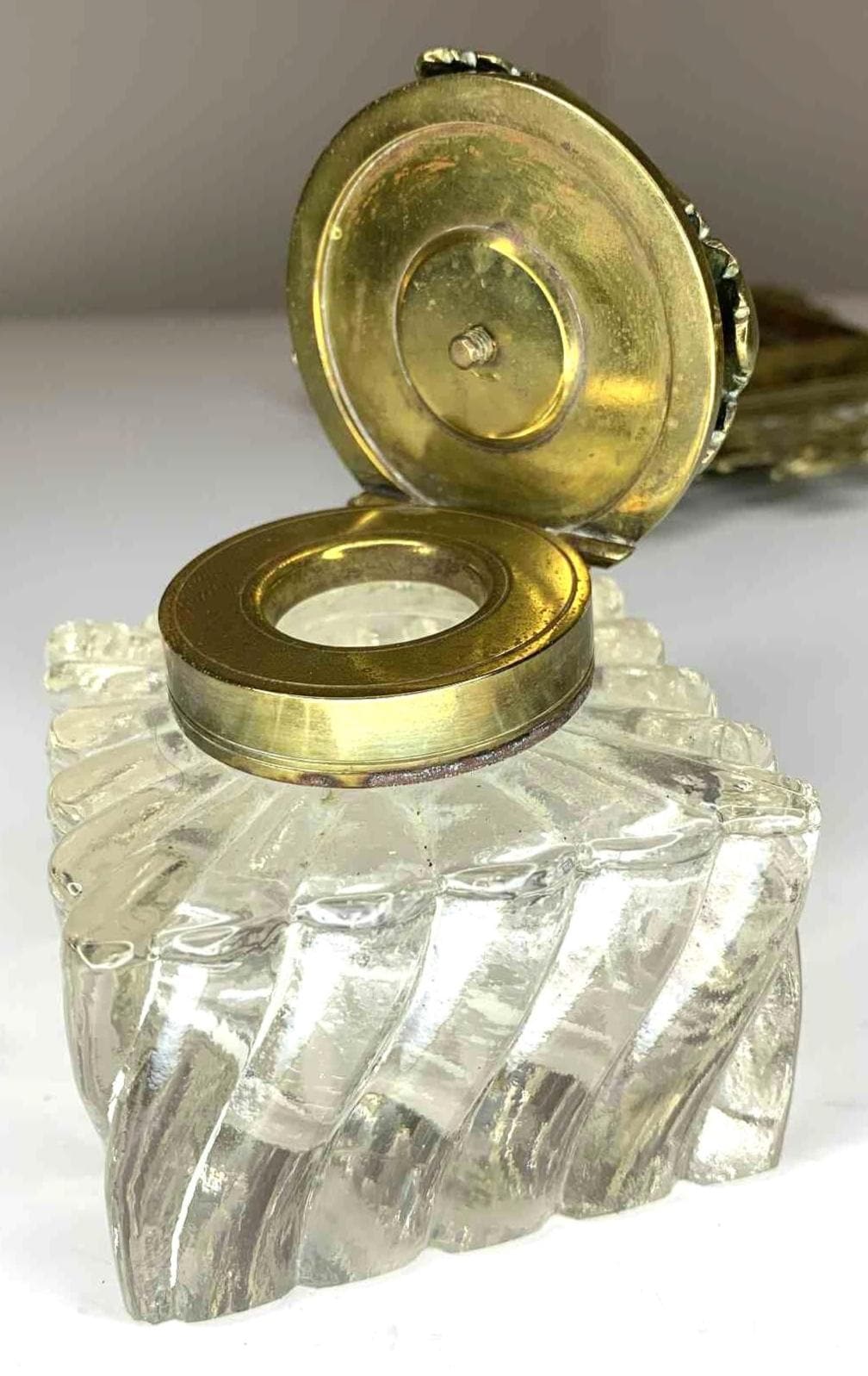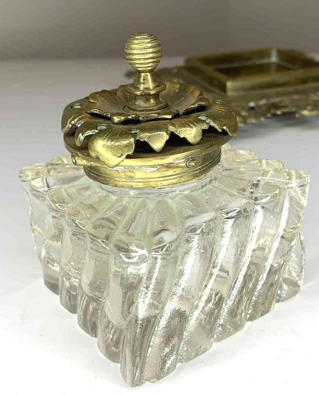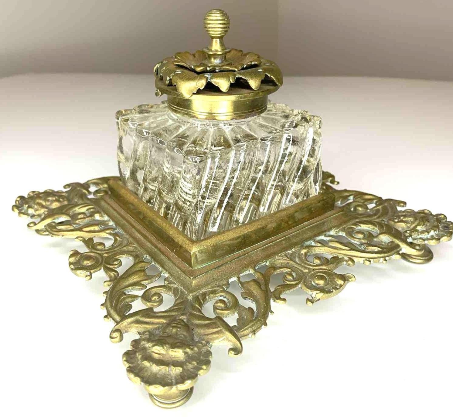 Ornate Vintage Solid Brass Ink Well Holder With Crystal Well