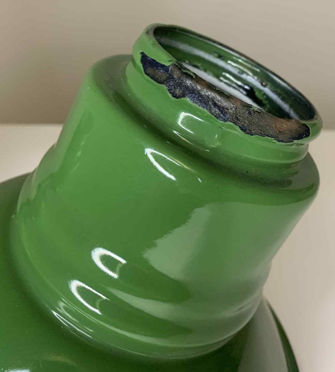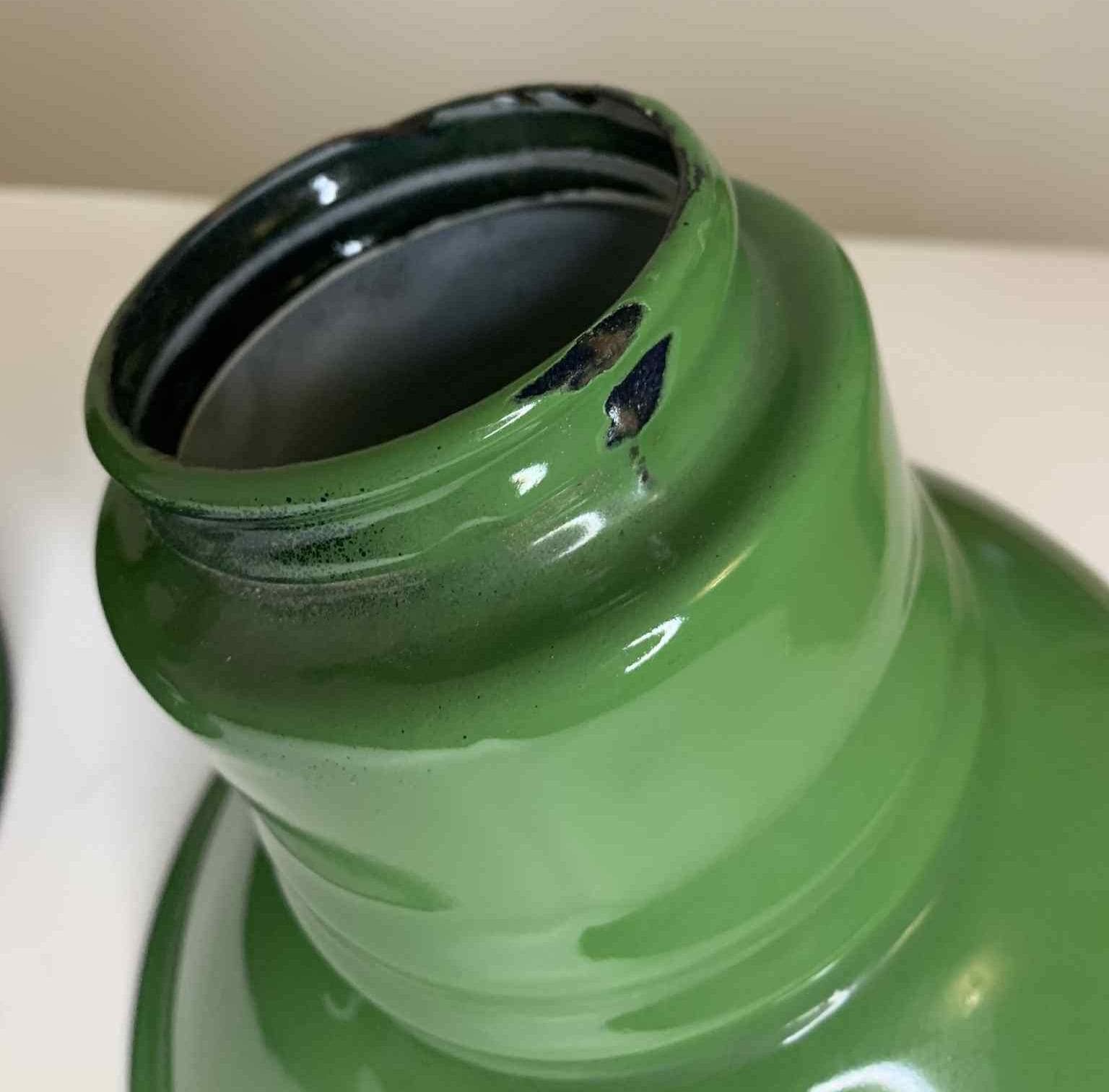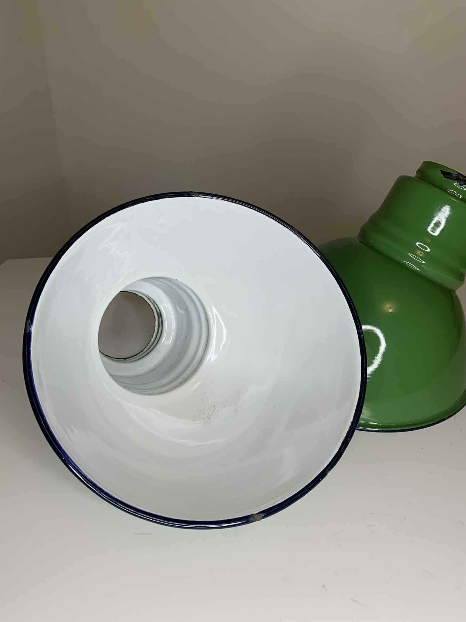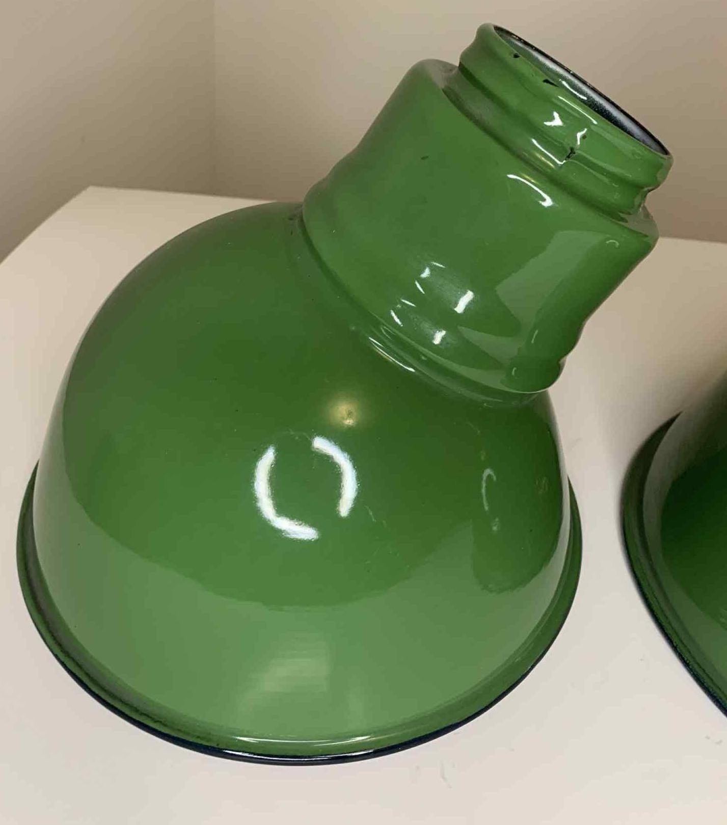 Pair of Vintage Industrial Angled Green Porcelain Shades - Garage / Mancave / Gas Station - 8.5" Diameter